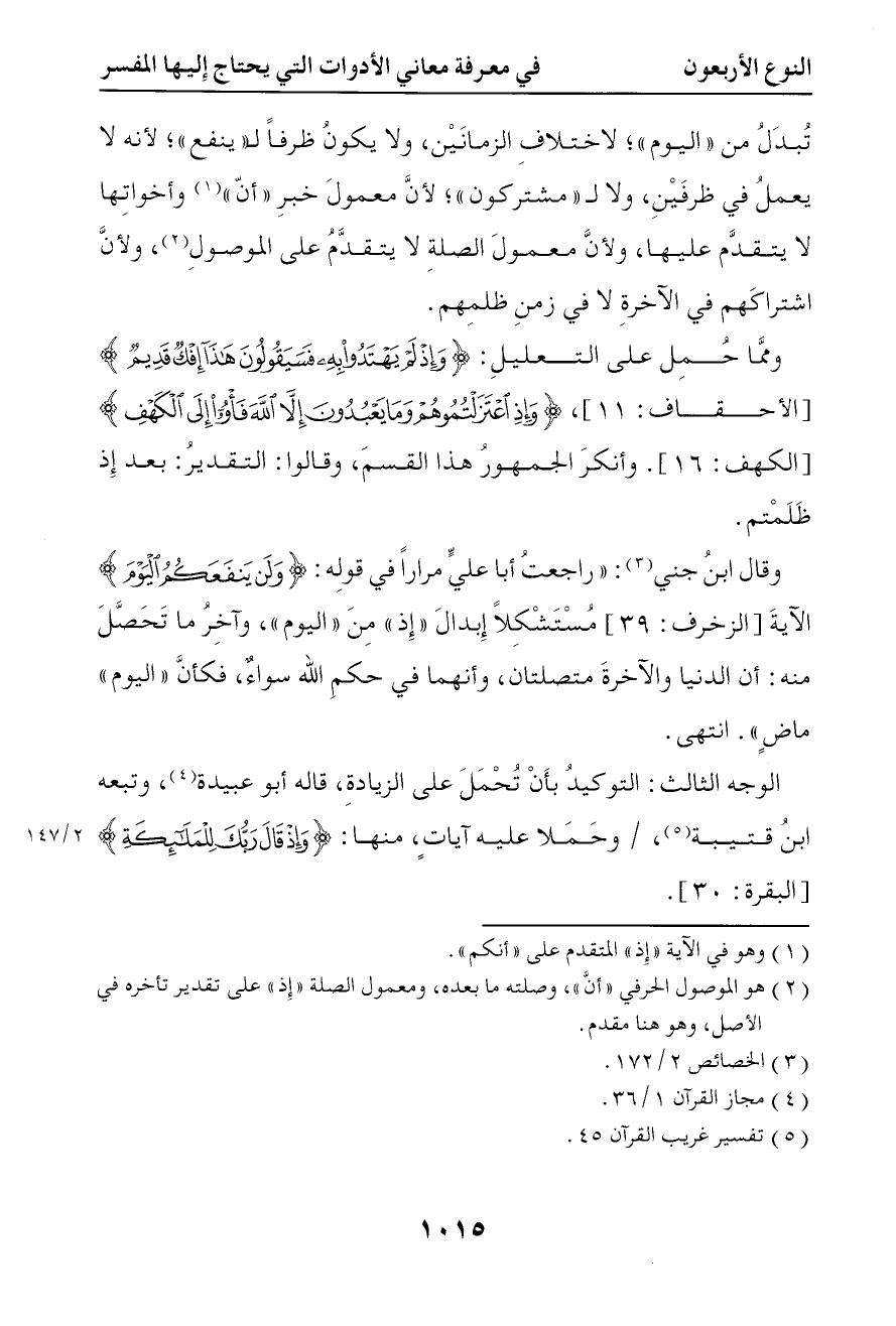 2951 وقال ابن جني راجعت أبا علي مرارا في قوله تعالى { ولن ينفعكم اليوم } الآية مستشكلا إبدال إذ من اليوم وآخر ما تحصل منه أن الدنيا والآخرة متصلتان وأنهما في حكم الله سواء فكأن اليوم ماض انتهى