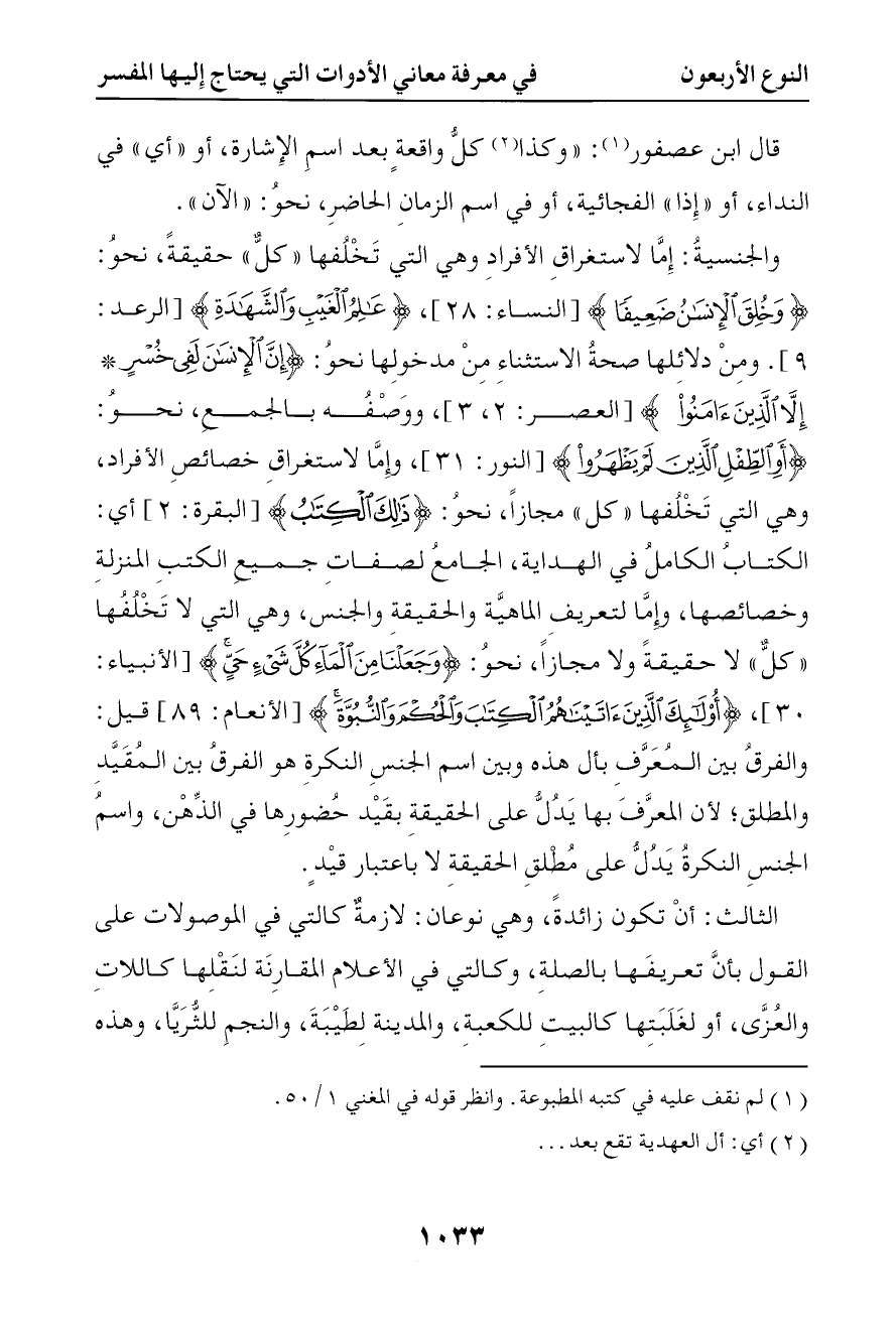 2991 والجنسية إما لاستغراق الأفراد وهي التي تخلفها كل حقيقة نحو { وخلق الإنسان ضعيفا } { عالم الغيب والشهادة } ومن دلائلها صحة الاستثناء من مدخولها نحو { إن الإنسان لفي خسر إلا الذين آمنوا } ووصفه بالجمع نحو { أو الطفل الذين لم يظهروا } وإما لاستغراق خصائص الأفراد وهي التي تخلفها كل مجازا نحو { ذلك الكتاب } أي الكتاب الكامل في الهداية الجامع لصفات جميع الكتب المنزلة وخصائصها وإما لتعريف الماهية والحقيقة والجنس وهي التي لا تخلفها كل لا حقيقة ولا مجازا نحو { وجعلنا من الماء كل شيء حي } { أولئك الذين آتيناهم الكتاب والحكم والنبوة } قيل والفرق بين المعرف بأل وبين اسم الجنس النكرة هو الفرق بين المقيد والمطلق لأن المعرف بها يدل على الحقيقة بقيد حضورها في الذهن واسم الجنس النكرة يدل على مطلق الحقيقة لا باعتبار قيد