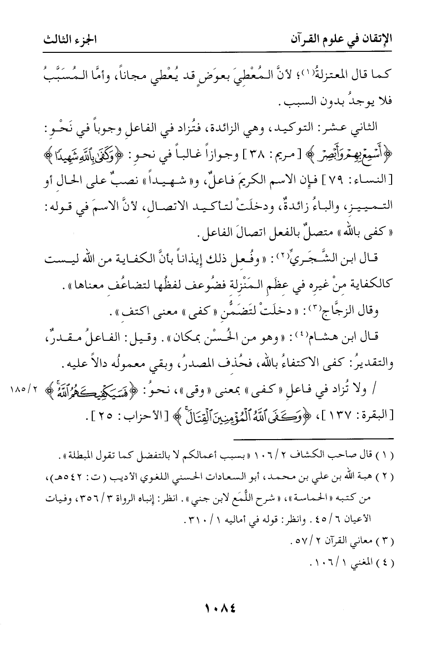 3112 وقيل الفاعل مقدر والتقدير كفى الاكتفاء بالله فحذف المصدر وبقي معموله دالا عليه ولا تزاد في فاعل كفى بمعنى وقى نحو { فسيكفيكهم الله } { وكفى الله المؤمنين القتال