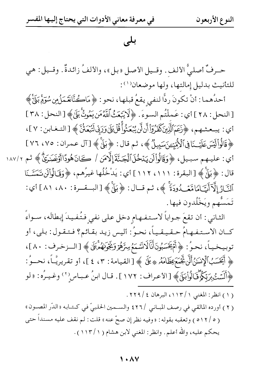 أحدهما أن تكون ردا لنفي يقع قبلها نحو { ما كنا نعمل من سوء بلى } أي عملتم السوء { لا يبعث الله من يموت بلى } أي يبعثهم { زعم الذين كفروا أن لن يبعثوا قل بلى وربي لتبعثن } { قالوا ليس علينا في الأميين سبيل } ثم قال { بلى } أي عليهم سبيل { وقالوا لن يدخل الجنة إلا من كان هودا أو نصارى } ثم قال { بلى } أي يدخلها غيرهم { وقالوا لن تمسنا النار إلا أياما معدودة } ثم قال { بلى } أي تمسهم ويخلدون فيها