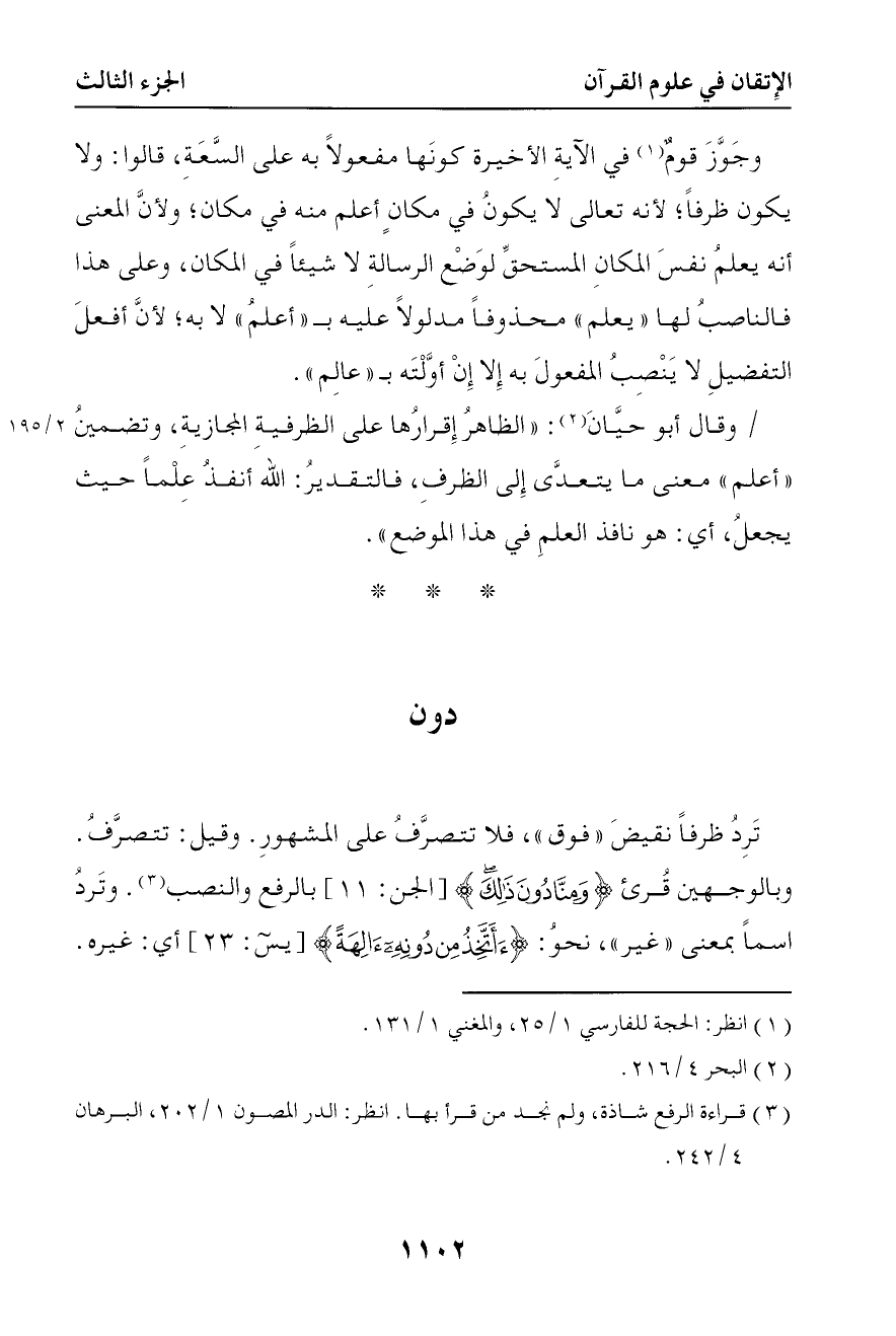 3149 وقال أبو حيان الظاهر إقرارها على الظرفية المجازية وتضمين أعلم معنى ما يتعدى إلى الظرف فالتقدير الله أنفذ علما حيث يجعل أي هو نافذ العلم في هذا الموضع 43 - دون