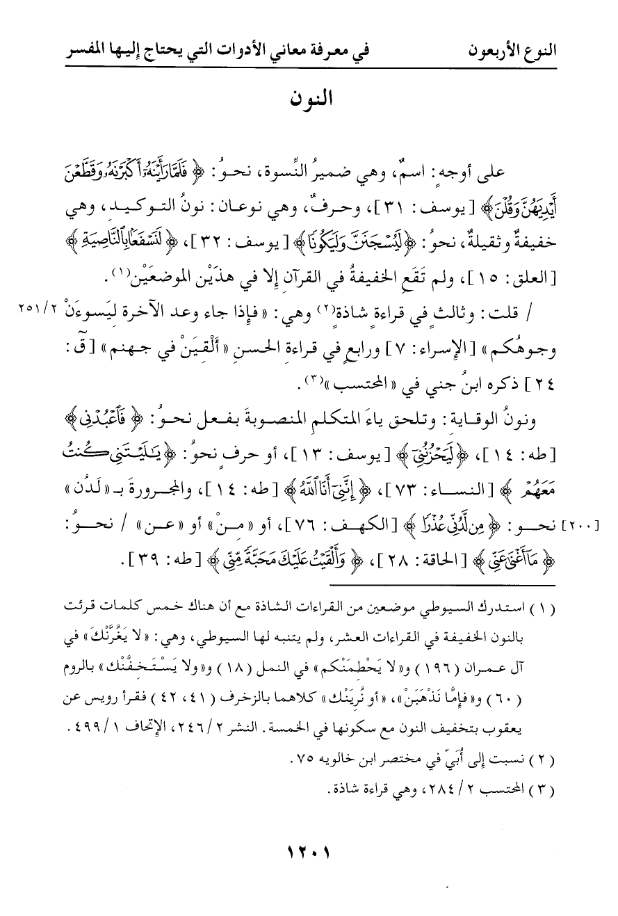 اسم وهي ضمير النسوة نحو { فلما رأينه أكبرنه وقطعن أيديهن وقلن } وحرف وهي نوعان نون التوكيد وهي خفيفة وثقيلة نحو { ليسجنن وليكونن } { لنسفعا بالناصية } ولم تقع الخفيفة في القرآن إلا في هذين الموضعين