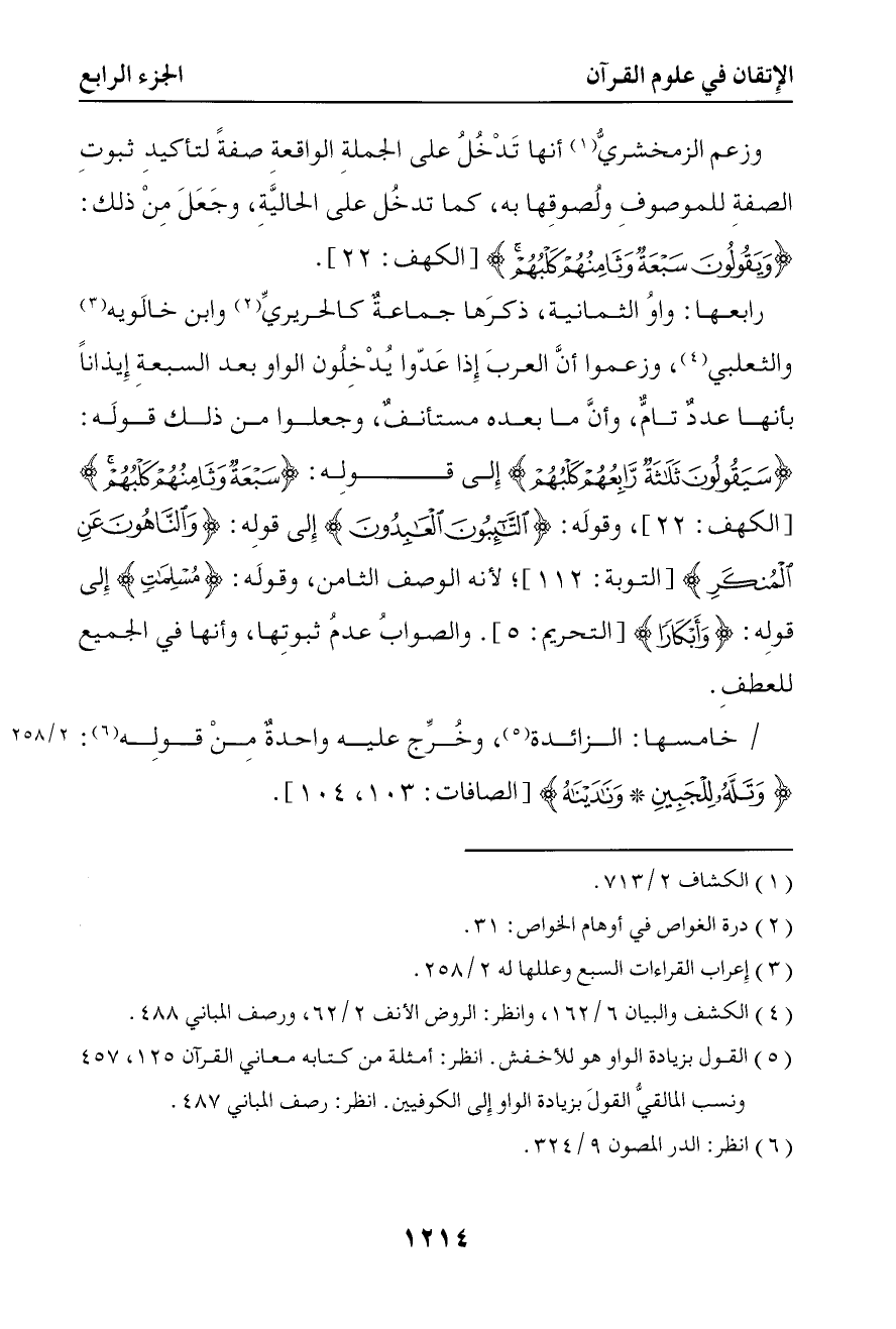 3420 وزعم الزمخشري أنها تدخل على الجملة الواقعة صفة لتأكيد ثبوت الصفة للموصوف ولصوقها بها كما تدخل على الحالية وجعل من ذلك { ويقولون سبعة وثامنهم كلبهم }