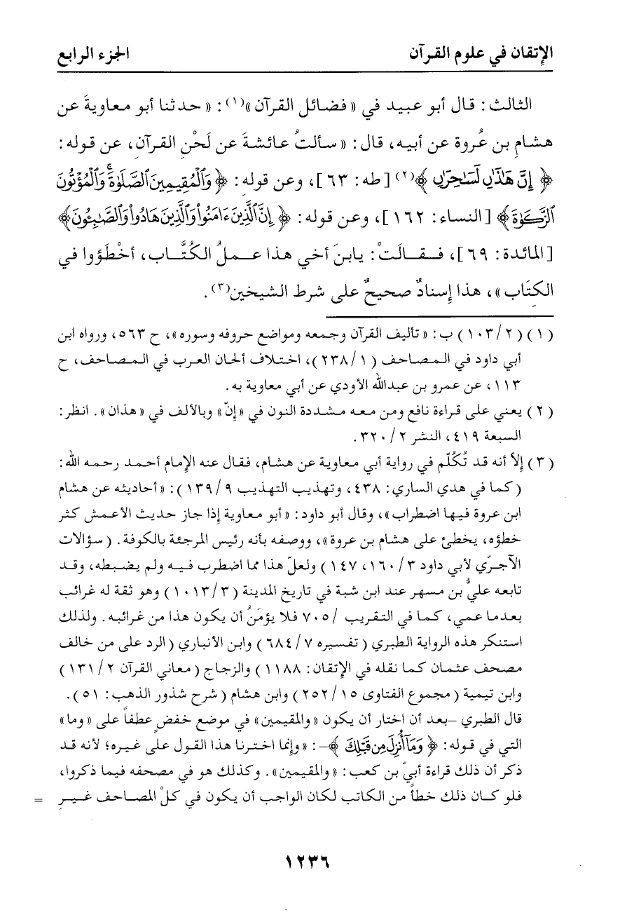 3482 قال أبو عبيد في فضائل القرآن حدثنا أبو معاوية عن هشام بن عروة عن أبيه قال سألت عائشة عن لحن القرآن عن قوله تعالى { إن هذان لساحران } وعن قوله تعالى { والمقيمين الصلاة والمؤتون الزكاة } وعن قوله تعالى { إن الذين آمنوا والذين هادوا والصابئون } فقالت يا بن أخي هذا عمل الكتاب أخطئوا في الكتاب هذا إسناد صحيح على شرط الشيخين