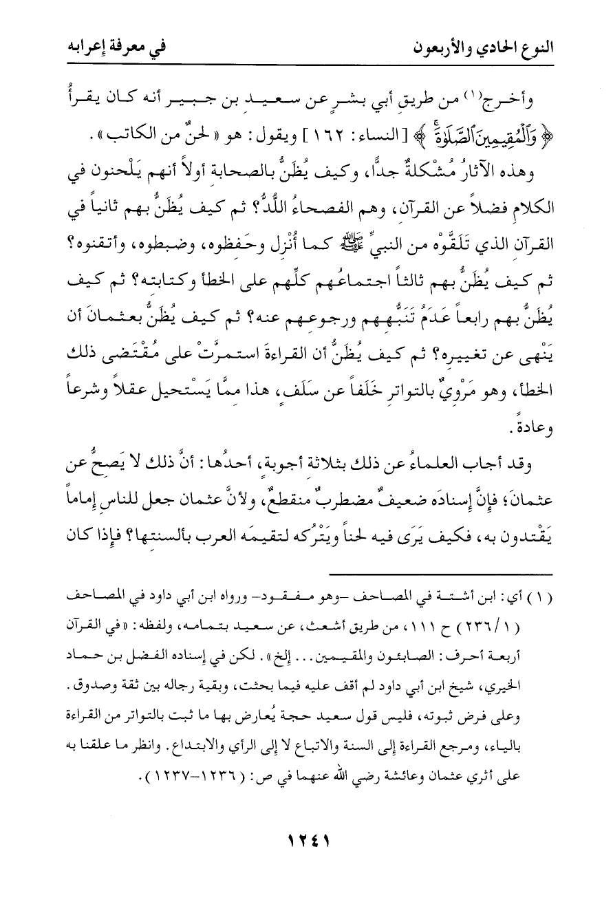 3486 وهذه الآثار مشكلة جدا وكيف يظن بالصحابة أولا أنهم يلحنون في الكلام فضلا عن القرآن وهم الفصحاء اللد ثم كيف يظن بهم ثانيا في القرآن الذي تلقوه من النبي صلى الله عليه وسلم كما أنزل وحفظوه وضبطوه وأتقوه ثم كيف يظن بهم ثالثا اجتماعهم كلهم على الخطأ وكتابته ثم كيف يظن بهم رابعا عدم تنبههم ورجوعهم عنه ثم كيف يظن بعثمان أنه ينهي عن تغييره ثم كيف يظن أن القراءة استمرت على مقتضي ذلك الخطأ وهو مروي بالتواتر خلفا عن سلف هذا مما يستحيل عقلا وشرعا وعادة وقد أجاب العلماء عن ذلك بثلاثة أجوبة