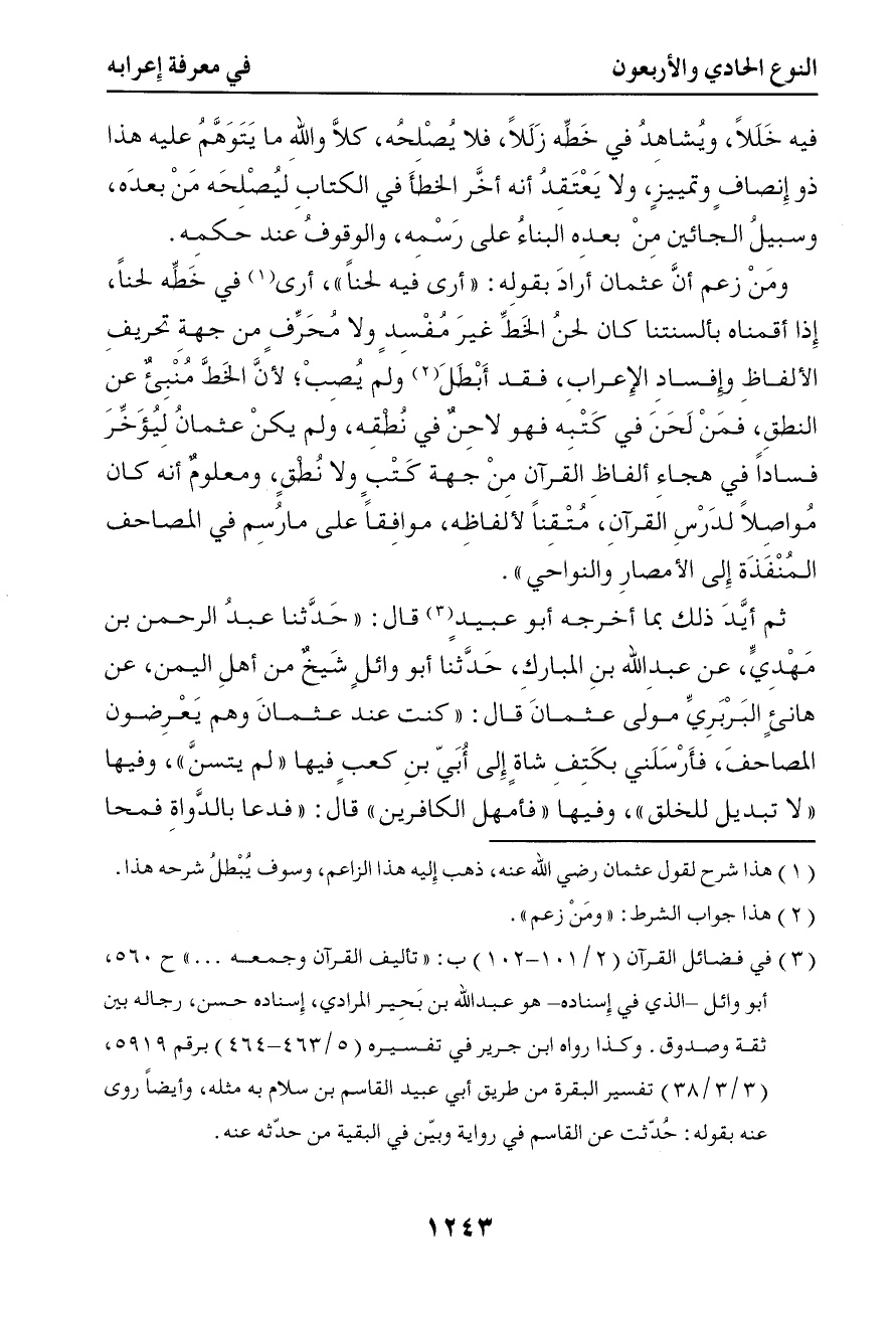 فيه خللا ويشاهد في خطه زللا فلا يصلحه كلا والله ما يتوهم عليه هذا ذو إنصاف وتمييز ولا يعتقد أنه أخر الخطأ في الكتاب ليصلحه من بعده وسبيل الجائين من بعده البناء على رسمه والوقوف عند حكمه ومن زعم أن عثمان أراد بقوله أرى فيه لحنا أرى في خطه لحنا إذا أقمناه بألسنتنا كان لحن الخط غير مفسد ولا محرف من جهة تحريف الألفاظ وإفساد الإعراب فقد أبطل ولم يصب لأن الخط منبئ عن النطق فمن لحن في كتبه فهو لاحن في نطقه ولم يكن عثمان ليؤخر فسادا في هجاء ألفاظ القرآن من جهة كتب ولا نطق ومعلوم أنه كان مواصلا لدرس القرآن متقنا لألفاظه موافقا على ما رسم في المصاحف المنقذة إلى الأمصار والنواحي ثم أيد ذلك بما أخرجه أبو عبيد قال حدثنا عبد الرحمن بن مهدي عن عبد الله بن مبارك حدثنا أبو وائل شيخ من أهل اليمن عن هانئ البربري مولى عثمان قال كنت عند عثمان وهم يعرضون المصاحف فأرسلني بكتف شاة إلى أبي بن كعب فيها لم يتسن وفيها لا تبديل للخلق وفيها فأمهل الكافرين قال فدعا بالدواة فمحا