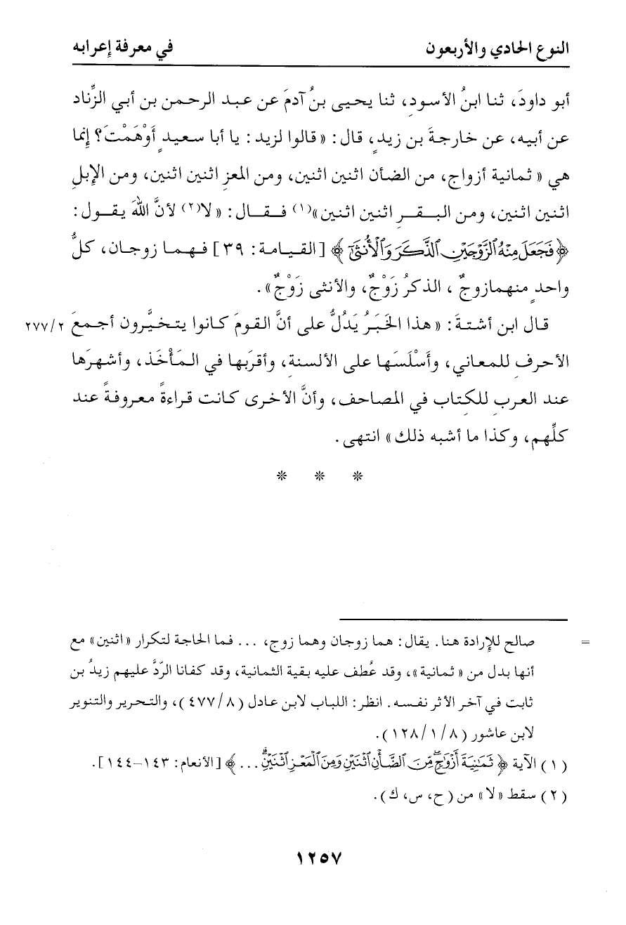 أبو داود حدثنا ابن الأسود حدثنا يحيى بن آدم عن عبد الرحمن بن أبي الزناد عن أبيه عن خارجة بن زيد قال قالوا لزيد يا أبا سعيد أوهمت إنما هي ثمانية أزواج من الضأن اثنين اثنين ومن المعز اثنين اثنين ومن الإبل اثنين اثنين ومن البقر اثنين اثنين فقال لأن الله تعالى يقول { فجعل منه الزوجين الذكر والأنثى } فهما زوجان كل واحد منهما زوج الذكر زوج والأنثى زوج
