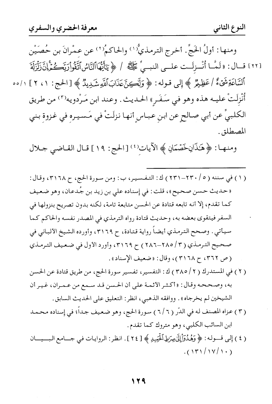 216 ومنها أول الحج أخرج الترمذي والحاكم عن عمران بن حصين قال لما نزلت على النبي صلى الله عليه وسلم { يا أيها الناس اتقوا ربكم إن زلزلة الساعة شيء عظيم } إلى قوله { ولكن عذاب الله شديد } نزلت عليه هذه وهو في سفر . . . الحديث وعند ابن مردويه من طريق الكلبي عن أبي صالح عن ابن عباس أنها نزلت في مسيره في غزوة بني المصطلق