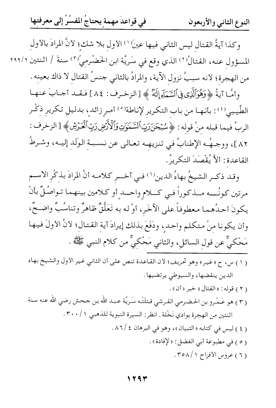 وكذا آية القتال ليس الثاني فيها عين الأول بلا شك لأن المراد بالأول المسؤول عنه القتال الذي وقع في سرية ابن الحضرمي سنة اثنتين من الهجرة لأنه سبب نزول الآية والمراد بالثاني جنس القتال لا ذاك بعينه وأما آية { وهو الذي في السماء إله } فقد أجاب عنها الطيبي أنها من باب التكرير لإفادة أمر زائد بدليل تكرير ذكر الرب فيما قبله من قوله { سبحان رب السماوات والأرض رب العرش } ووجهه الأطناب في تنزيهه تعالى عن نسبة الولد إليه وشرط القاعدة ألا يقصد التكرير