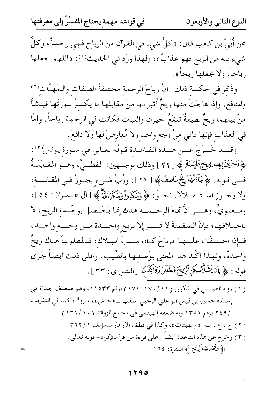 عن أبي بن كعب قال كل شيء في القرآن من الرياح فهو رحمة وكل شيء فيه من الريح فهو عذاب ولهذا ورد في الحديث اللهم اجعلها رياحا ولا تجعلها ريحا وذكر في حكمة ذلك أن رياح الرحمة مختلفة الصفات والمهبات والمنافع وإذا هاجت منها ريح أثير لها من مقابلها ما يكسر سورتها فينشأ من بينهما ريح لطيفة تنفع الحيوان والنبات فكانت في