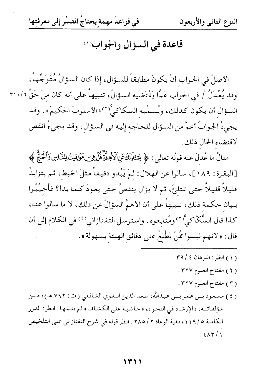 3697 الأصل في الجواب أن يكون مطابقا للسؤال إذا كان السؤال متوجها وقد يعدل في الجواب عما يقتضيه السؤال تنبيها على أنه كان من حق السؤال أن يكون كذلك ويسميه السكاكي الأسلوب الحكيم