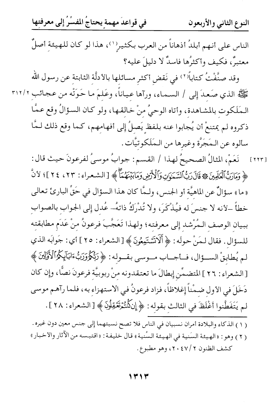 الناس على أنهم أبلد أذهانا من العرب بكثير هذا لو كان للهيئة أصل معتبر فكيف وأكثرها فاسد لا دليل عليه وقد صنفت كتابا في نقض أكثر مسائلها بالأدلة الثابتة عن رسول الله صلى الله عليه وسلم الذي صعد إلى السماء ورآها عيانا وعلم ما حوته من عجائب الملكوت بالمشاهدة وأتاه الوحي من خالقها ولو كان السؤال وقع عما ذكروه لم يمتنع أن يجابوا عنه بلفظ يصل إلى أفهامهم كما وقع ذلك لما سألوا عن المجرة وغيرها من الملكوتيات نعم المثال الصحيح لهذا القسم جواب موسى لفرعون حيث قال { وما رب العالمين قال رب السماوات والأرض وما بينهما } لأن ما سؤال عن الماهية والجنس ولما كان هذا السؤال في حق البارئ سبحانه وتعالى خطأ لأنه لا جنس له فيذكر ولا تدرك ذاته عدل إلى الجواب بالصواب ببيان الوصف المرشد إلى معرفته ولهذا تعجب فرعون من عدم مطابقته للسؤال فقال لمن حوله { ألا تستمعون } أي جوابه الذي لم يطابق السؤال فأجاب موسى بقوله { ربكم ورب آبائكم الأولين } المتضمن إبطال ما يعتقدونه من ربوبية فرعون نصا وإن كان دخل في الأول ضمنا إغلاظا فزاد فرعون في الاستهزاء فلما رآهم موسى لم يتفطنوا أغلظ في الثالث بقوله { إن كنتم تعقلون
