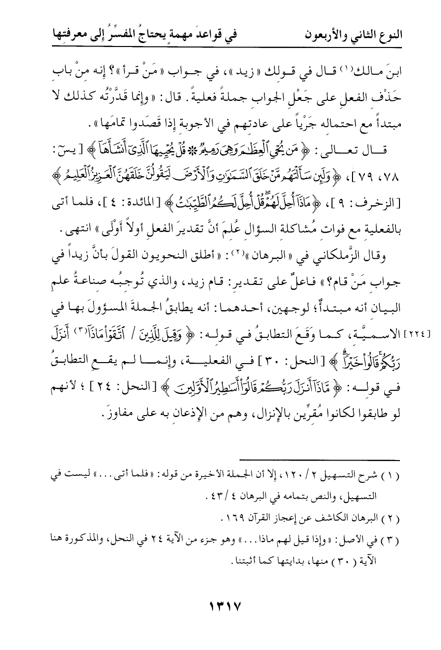قال في قولك زيد في جواب من قرأ إنه من باب حذف الفعل على جعل الجواب جملة فعلية قال وإنما قدرته كذلك لا مبتدأ مع احتماله جريا على عادتهم في الأجوبة إذا قصدوا تمامها قال تعالى { من يحيي العظام وهي رميم قل يحييها الذي أنشأها } { ولئن سألتهم من خلق السماوات والأرض ليقولن خلقهن العزيز العليم } { يسألونك ماذا أحل لهم قل أحل لكم الطيبات } فلما أتى بالفعلية مع فوات مشاكلة السؤال علم أن تقدير الفعل أولا أولى انتهى
