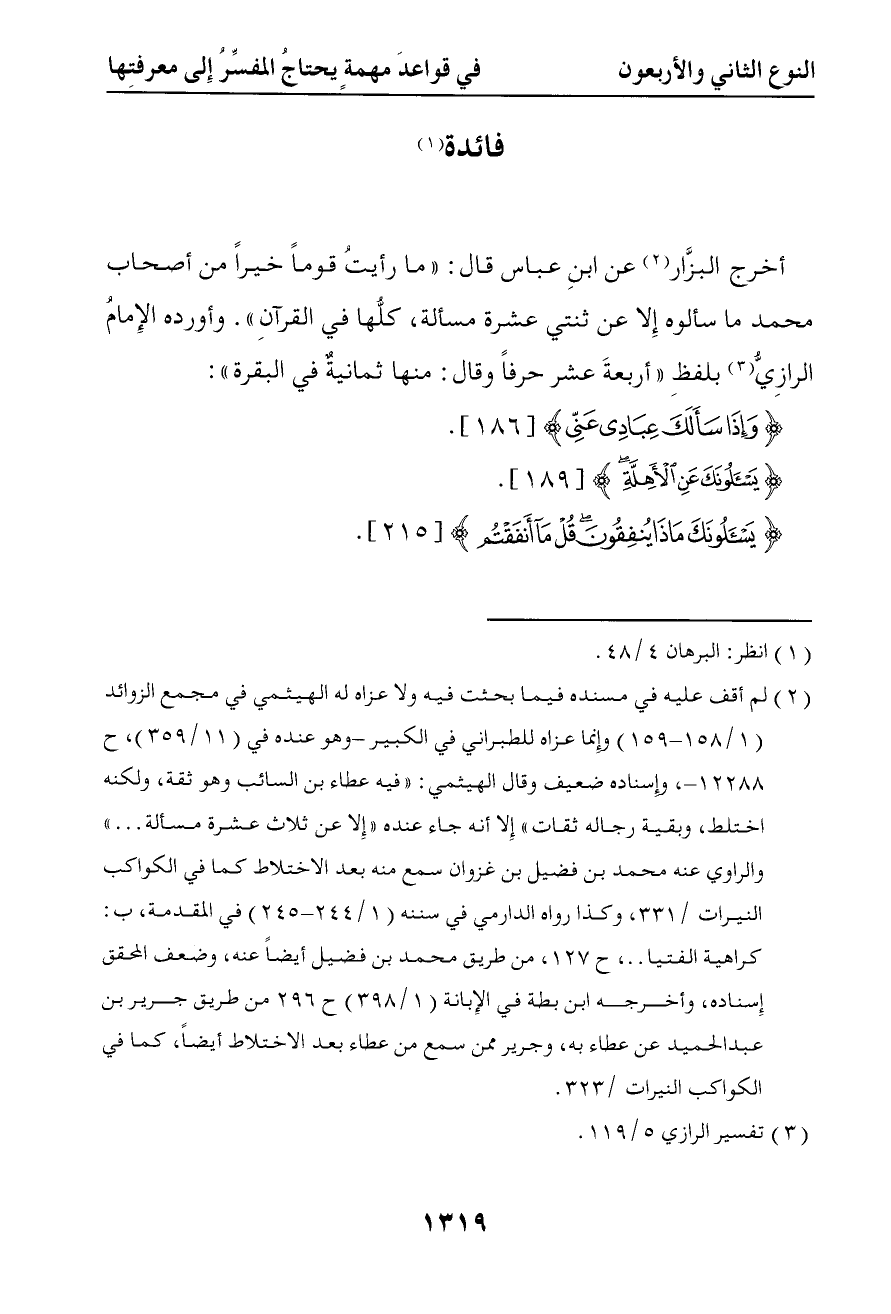 3714 أخرج البزار عن ابن عباس قال ما رأيت قوما خيرا من أصحاب محمد ما سألوه إلا عن اثنتي عشرة مسألة كلها في القرآن