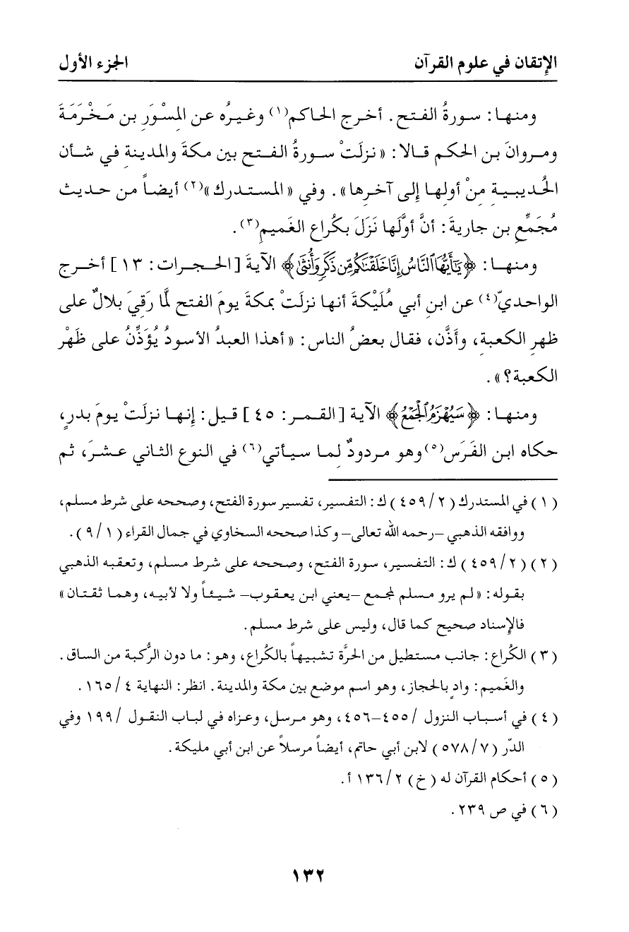 224 ومنها سورة الفتح أخرج الحاكم عن المسور بن مخرمة ومروان بن الحكم قالا نزلت سورة الفتح بين مكة والمدينة في شأن الحديبية من أولها إلى آخرها وفي المستدرك أيضا من حديث مجمع بن جارية أن أولها نزل بكراع الغميم