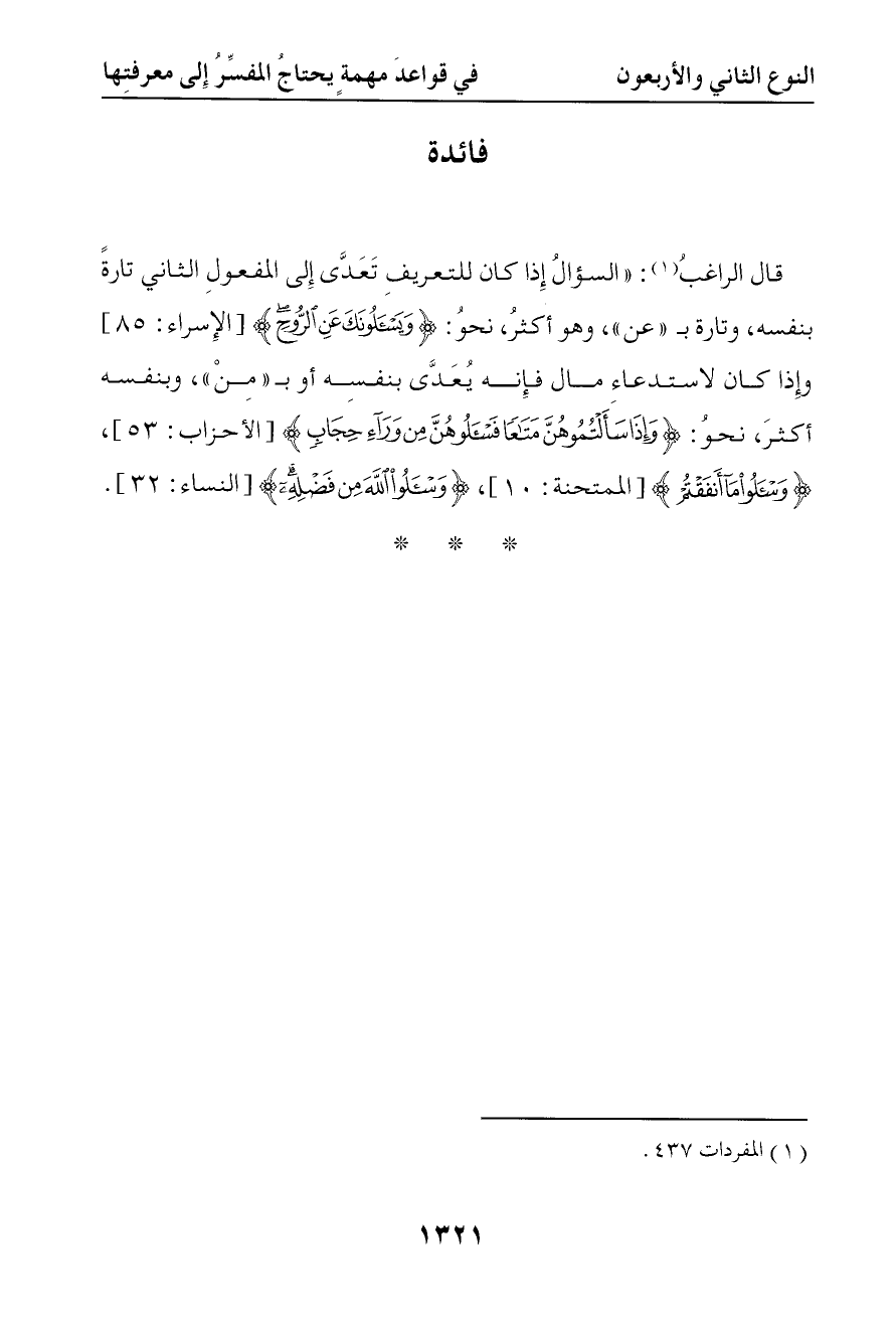 3716 قال الراغب السؤال إذا كان للتعريف تعدى إلى المفعول الثاني تارة بنفسه وتارة ب عن وهو أكثر نحو { ويسألونك عن الروح } وإذا كان لاستدعاء مال فإنه يعدى بنفسه أو بمن وبنفسه أكثر نحو { وإذا سألتموهن متاعا فاسألوهن من وراء حجاب } { واسألوا ما أنفقتم } { واسألوا الله من فضله