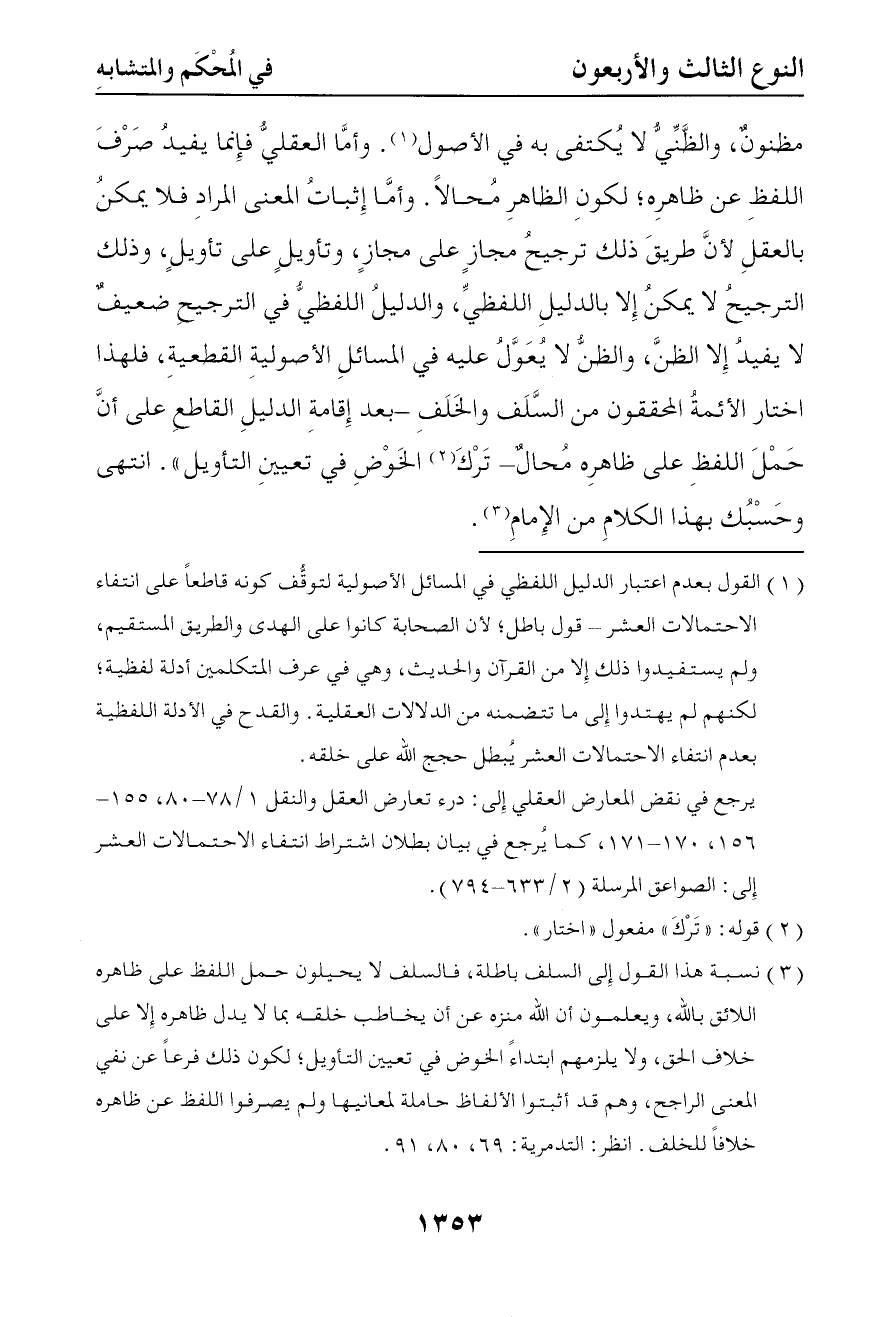 وأما العقلي فإنما يفيد صرف اللفظ من ظاهره لكونه الظاهر محالا وأما إثبات المعنى المراد فلا يمكن بالعقل لأن طريق ذلك ترجيح مجاز على مجاز وتأويل على تأويل وذلك الترجيح لا يمكن إلا بالدليل اللفظي والدليل اللفظي في الترجيح ضعيف لا يفيد إلا الظن والظن لا يعول عليه في المسائل الأصولية القطعية فلهذا اختار الأئمة المحققون من السلف والخلف بعد إقامة الدليل القاطع على أن حمل اللفظ على ظاهره محال ترك الخوض في تعيين التأويل