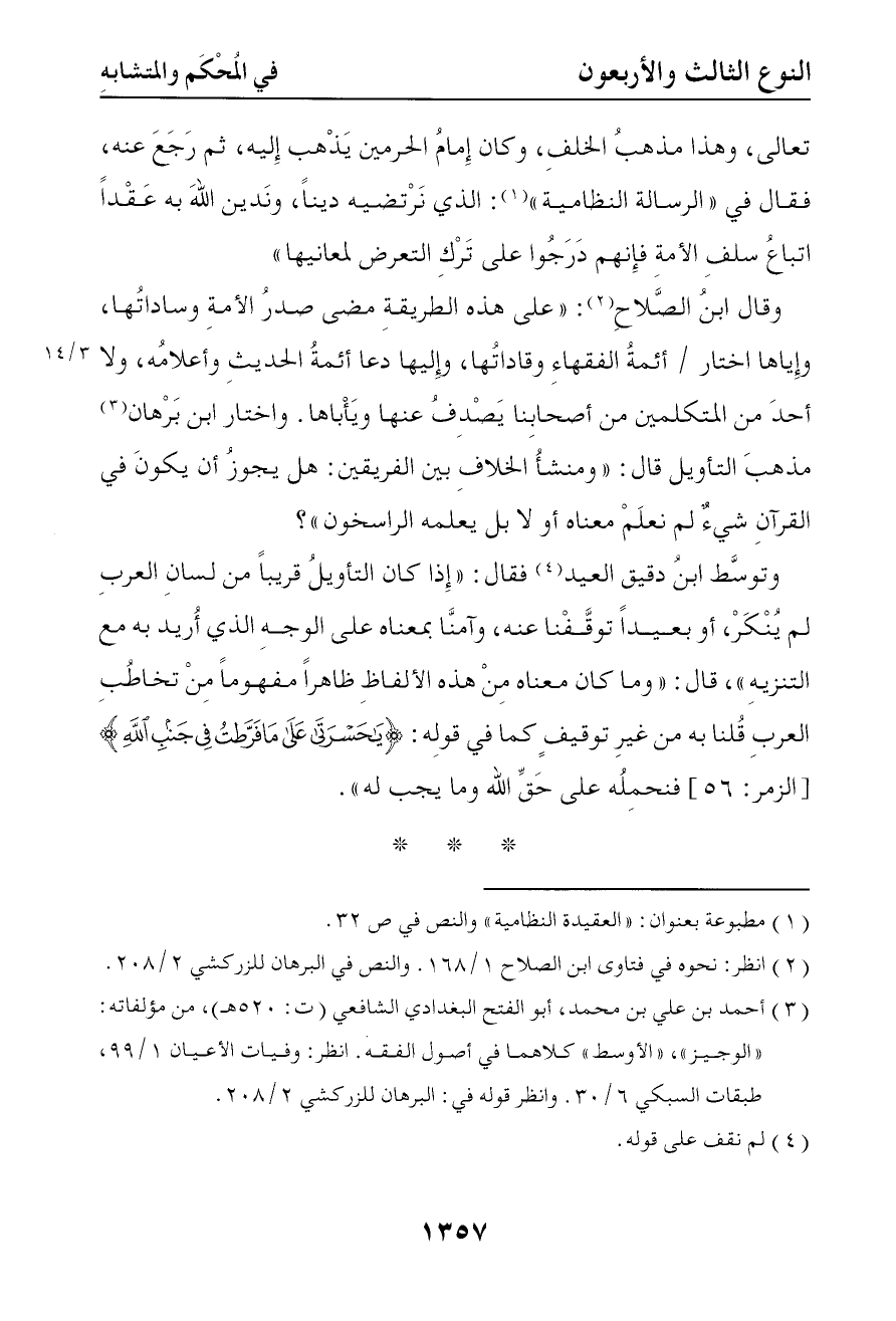وكان إمام الحرمين يذهب إليه ثم رجع عنه فقال في الرسالة النظامية الذي نرتضيه دينا وندين الله به عقدا إتباع سلف الأمة فإنهم درجوا على ترك التعرض لمعانيها