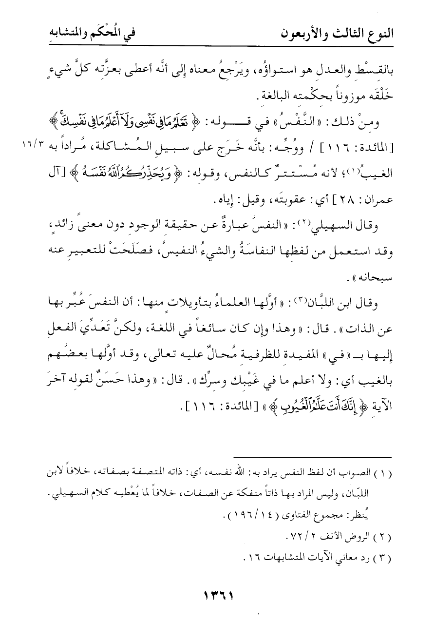 3804 وقال ابن اللبان أولها العلماء بتأويلات منها أن النفس عبر بها عن الذات قال وهذا وإن كان سائغا في اللغة ولكن تعدي الفعل إليها بفي المفيدة للظرفية محال عليه تعالى