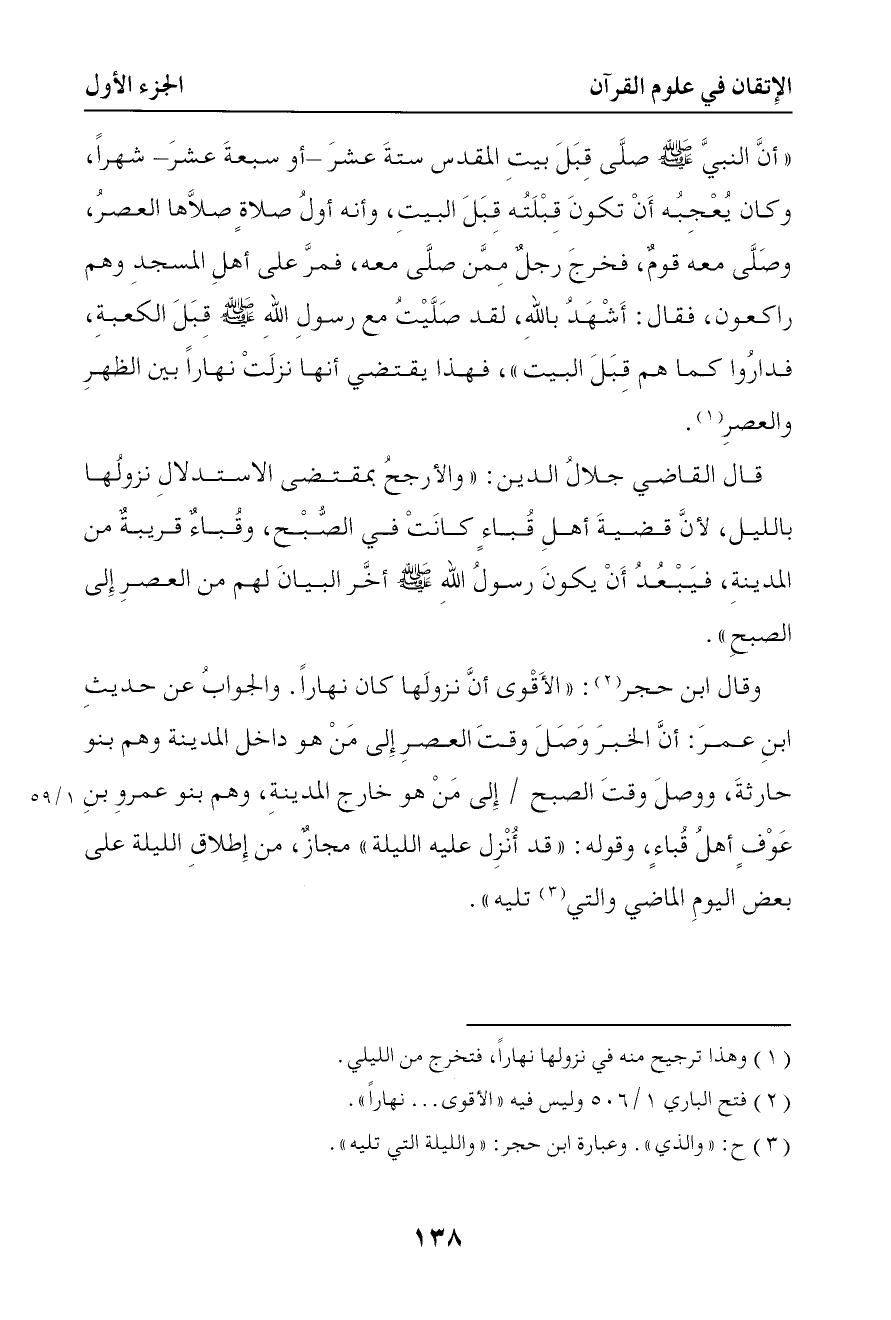238 قال القاضي جلال الدين والأرجح بمقتضى الاستدلال نزولها بالليل لأن قضية أهل قباء كانت في الصبح وقباء قريبة من المدينة فيبعد أن يكون رسول الله صلى الله عليه وسلم أخر البيان لهم من العصر إلى الصبح