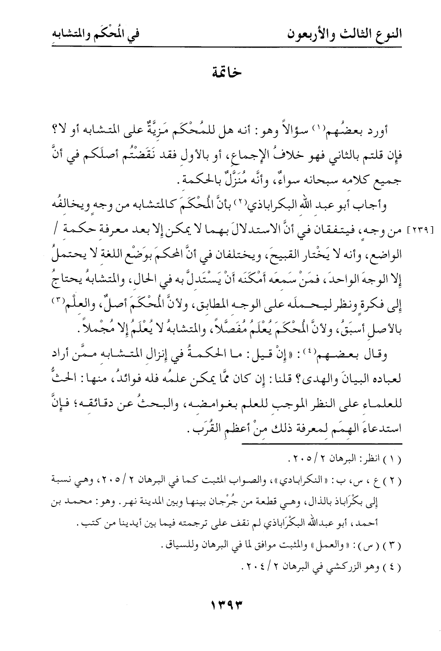 3911 وأجلب أبو عبد الله البكراباذي بأن المحكم كالمتشابه من وجه ويخالفه من وجه فيتفقان في أن الاستدلال بهما لا يمكن إلا بعد معرفة حكمة الواضع وأنه لا يختار القبيح ويختلفان في أن المحكم بوضع اللغة لا يحتمل إلا الوجه فمن سمعه أمكنه أن يستدل به في الحال والمتشابه يحتاج إلى فكرة ونظر ليحمله على الوجه المطابق ولأن المحكم أصل والعلم بالأصل أسبق ولأن المحكم يعلم مفصلا والمتشابه لا يعلم إلا مجملا