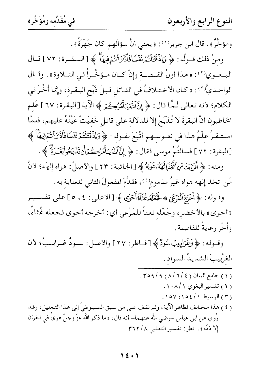 3923 ومن ذلك قوله { وإذ قتلتم نفسا فادارأتم فيها } قال البغوي هذه أول القصة وإن كان مؤخرا في التلاوة