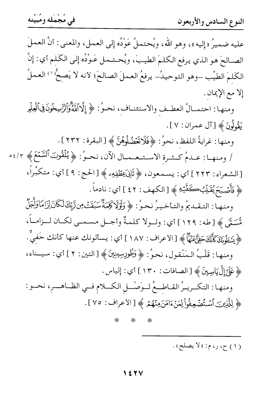 4021 ومنها عدم كثرة الاستعمال الآن نحو { يلقون السمع } أي يسمعون { ثاني عطفه } أي متكبرا { فأصبح يقلب كفيه } أي نادما