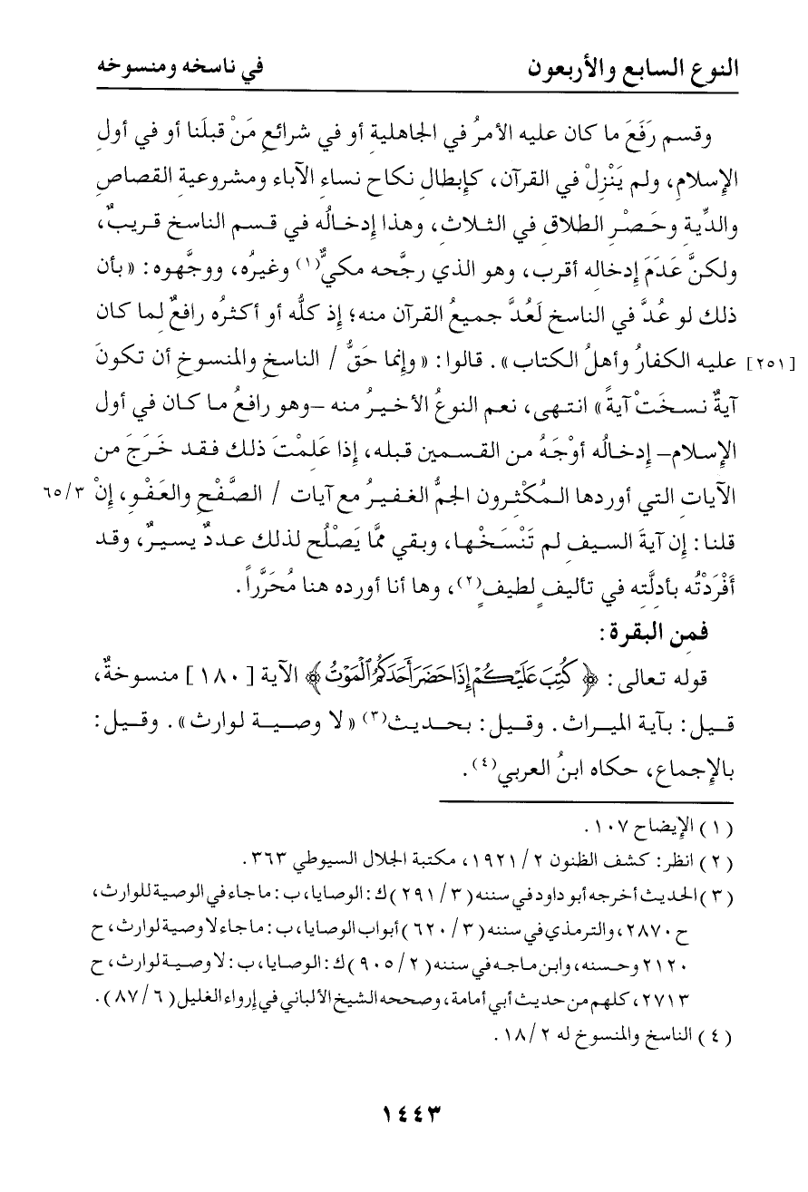4075 إذا عملت ذلك فقد خرج من الآيات التي أوردها المكثرون الجم الغفير مع آيات الصفح والعفو إن قلنا إن آية السيف لم تنسخها وبقي مما يصلح لذلك عدد يسير وقد أفردته بأدلته في تأليف لطيف وها أنا أورده هنا محررا