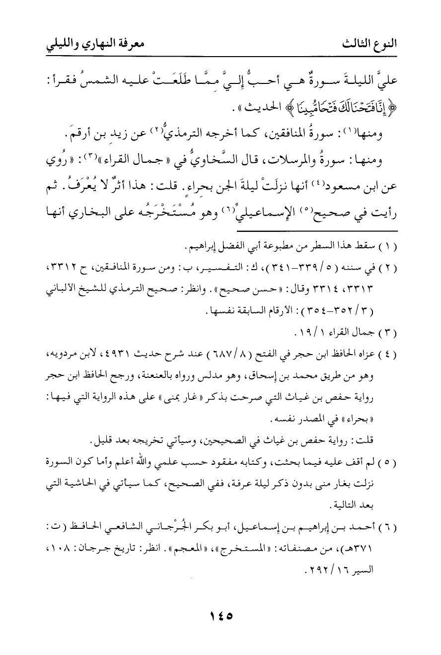 252 ومنها سورة المرسلات قال السخاوي في جمال القراء روي عن ابن مسعود أنها نزلت ليلة الجن بحراء