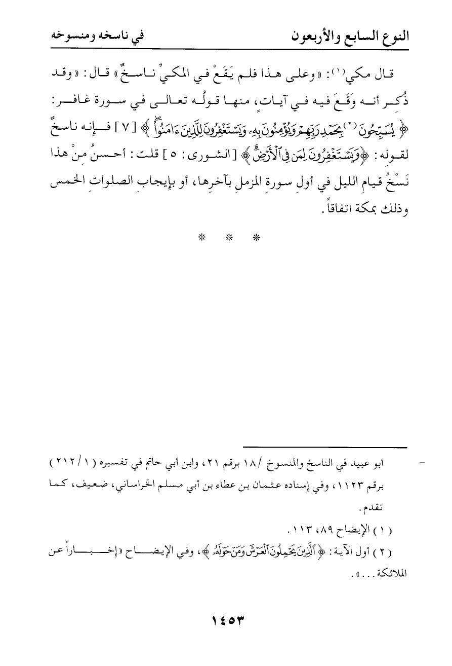 قال وقد ذكر أنه وقع في آيات منها قوله تعالى في سورة غافر { يسبحون بحمد ربهم ويؤمنون به ويستغفرون للذين آمنوا } فإنه ناسخ لقوله { ويستغفرون لمن في الأرض }