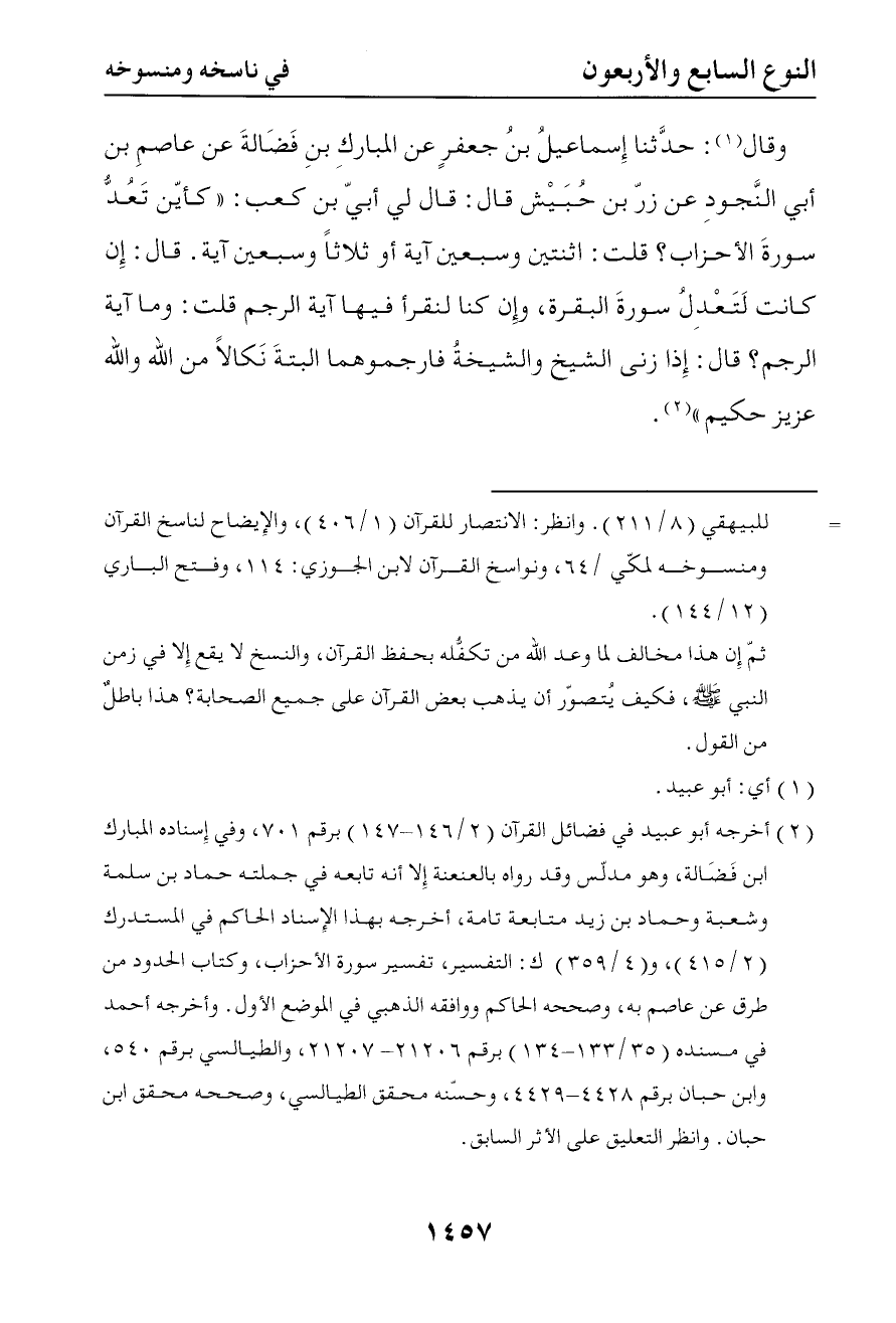 4119 وقال حدثنا إسماعيل بن جعفر عن المبارك بن فضالة عن عاصم بن أبي النجود عن زر بن حبيش قال قال لي أبي بن كعب كأي تعد سورة الأحزاب قلت اثنتين وسبعين آية أو ثلاثة وسبعين آية قال إن كانت لتعدل سورة البقرة وإن كنا لنقرأ فيها آية الرجم