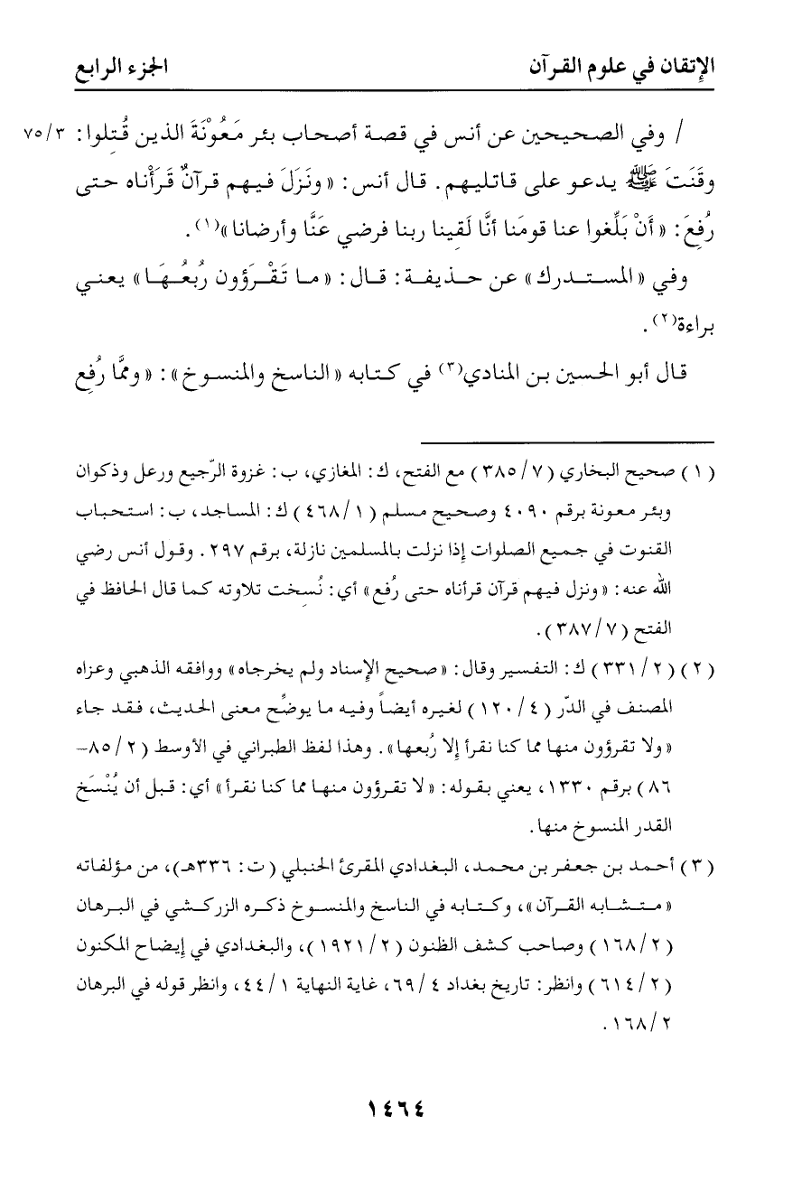 4130 وفي الصحيحين عن أنس في قصة أصحاب بئر معونة الذين قتلوا وقنت يدعو على قاتليهم قال أنس ونزل فيهم قرآن قرأناه حتى رفع ( أن بلغوا عنا قومنا أنا لقينا ربنا فرضي عنا وأرضانا )