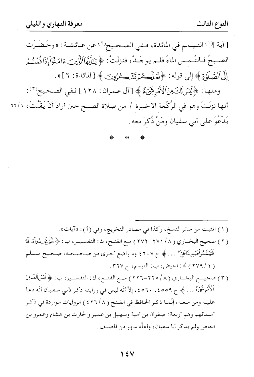 256 ومنها { ليس لك من الأمر شيء } ففي الصحيح أنها نزلت وهو في الركعة الأخيرة من صلاة الصبح حين أراد أن يقنت يدعو على أبي سفيان ومن ذكر معه