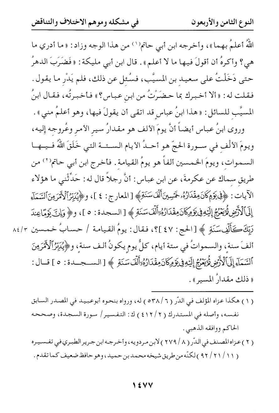 4158 وروى عن ابن عباس أيضا أن يوم الألف هو مقدار سير الأمر وعروجه إليه ويوم الألف في سورة الحج هو أحد الأيام الستة التي خلق الله فيها السموات ويوم الخمسين ألفا هو يوم القيامة