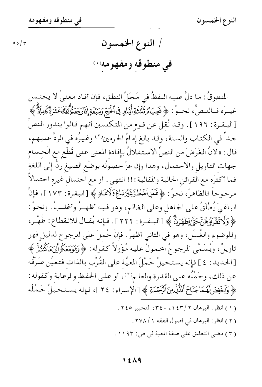 4191 المنطوق ما دل عليه اللفظ في محل النطق فإن أفاد معنى لا يحتمل غيره فالنص نحو { فصيام ثلاثة أيام في الحج وسبعة إذا رجعتم تلك عشرة كاملة } وقد نقل عن قوم من المتكلمين أنهم قالوا بندور النص جدا في الكتاب والسنة