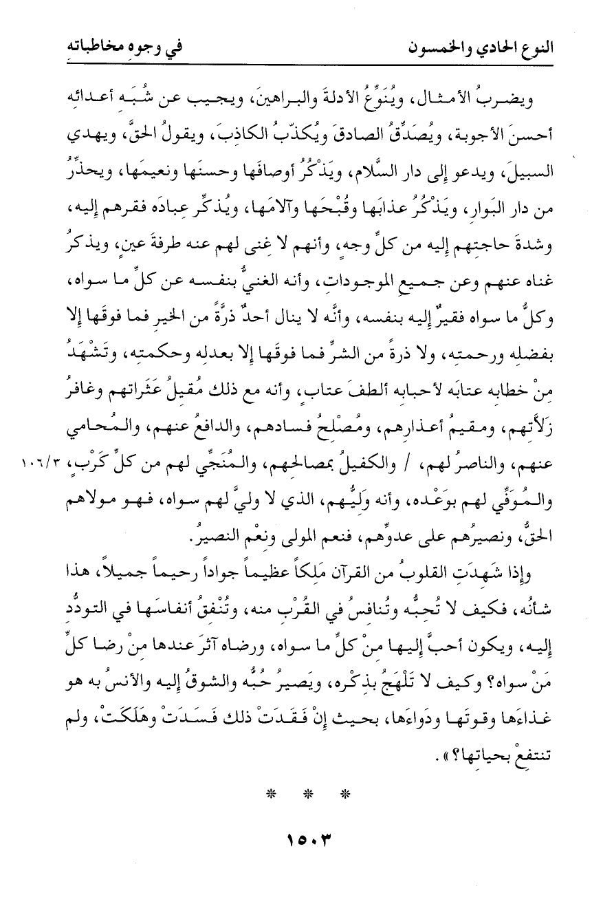 أحسن الأجوبة ويصدق الصادق ويكذب الكاذب ويقول الحق ويهدي السبيل ويدعو إلى دار السلام ويذكر أوصافها وحسنها ونعيمها ويحذر من دار البوار ويذكر عذابها وقبحها وآلامها ويذكر عباده فقرهم إليه وشدة حاجتهم إليه من كل وجه وأنهم لا غنى لهم عنه طرفة عين ويذكرهم غناه عنهم وعن جميع الموجودات وأنه الغني بنفسه عن كل ما سواه وكل ما سواه فقير إليه وأنه لن ينال أحد ذرة من الخير فما فوقها إلا بفضله ورحمته ولا ذرة من الشر فما فوقها إلا بعدله وحكمته وتشهد من خطابه عتابه لأحبابه ألطف عتاب وأنه مع ذلك مقيل عثراتهم وغافر زلاتهم ومقيم أعذارهم ومصلح فسادهم والدافع عنهم والحامي عنهم والناصر لهم والكفيل بمصالحهم والمنجي لهم من كل كرب والموفي لهم بوعده وأنه وليهم الذي لا ولي لهم سواه فهو مولاهم الحق ونصيرهم على عدوهم فنعم المولى ونعم النصير