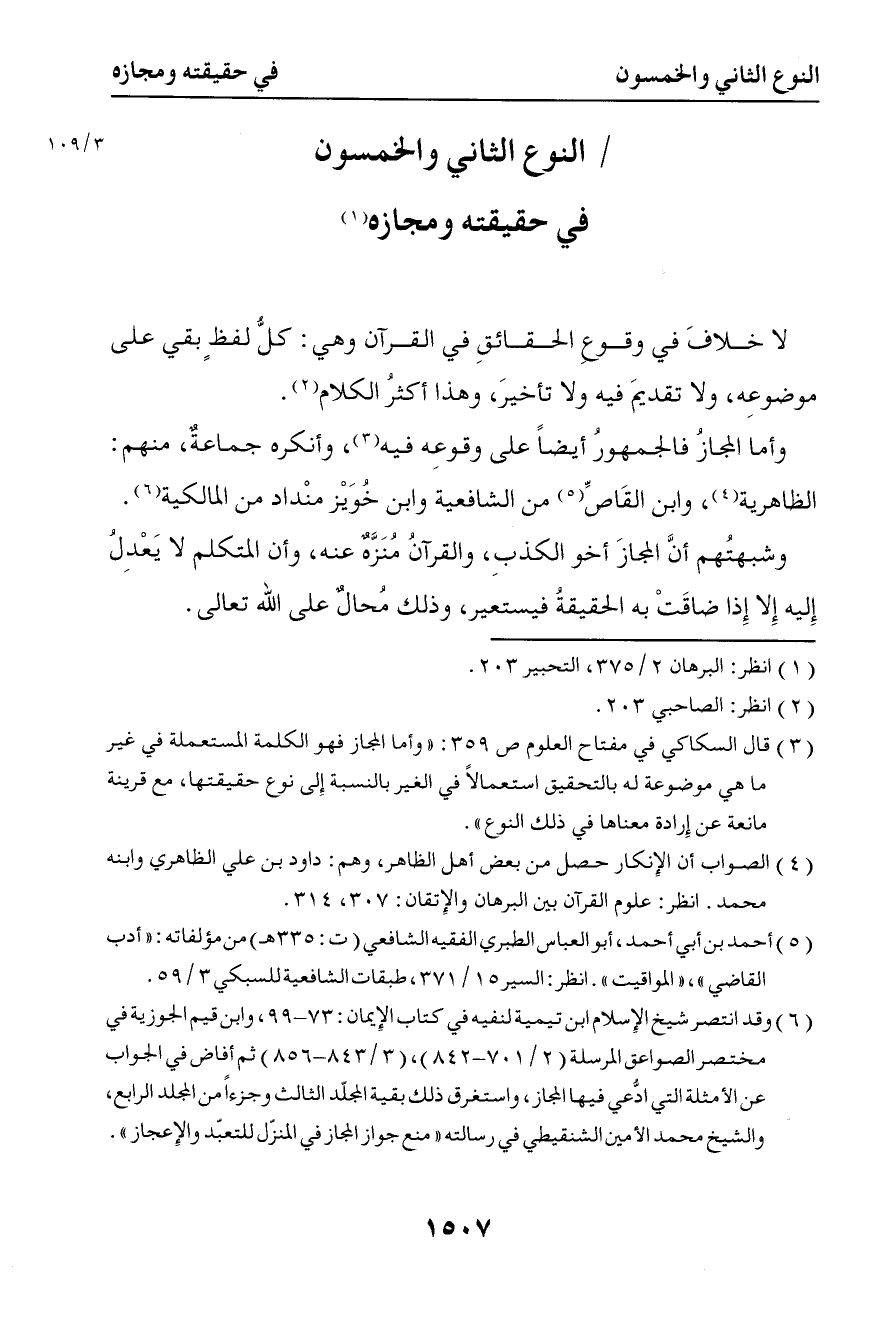 4259 لا خلاف في وقوع الحقائق في القرآن وهي كل لفظ بقي على موضوعه ولا تقديم فيه ولا تأخير وهذا أكثر الكلام