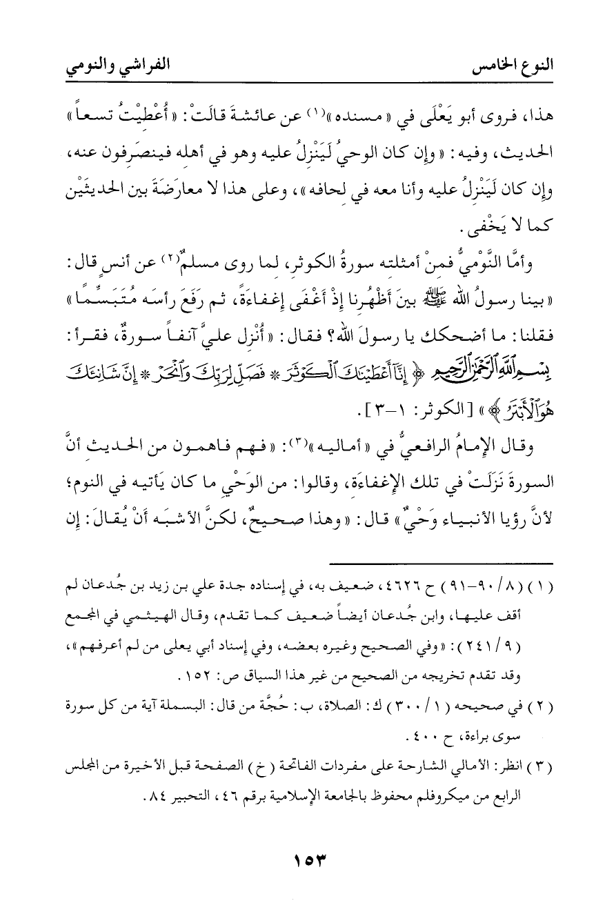 267 وأما النومي فمن أمثلته سورة الكوثر لما روى مسلم عن أنس قال بينا رسول الله صلى الله عليه وسلم بين أظهرنا إذ أغفى إغفاءة ثم رفع رأسه متبسما فقلنا ما أضحكك يا رسول الله فقال أنزل علي آنفا سورة فقرأ بسم الله الرحمن الرحيم { إنا أعطيناك الكوثر فصل لربك وانحر إن شانئك هو الأبتر }