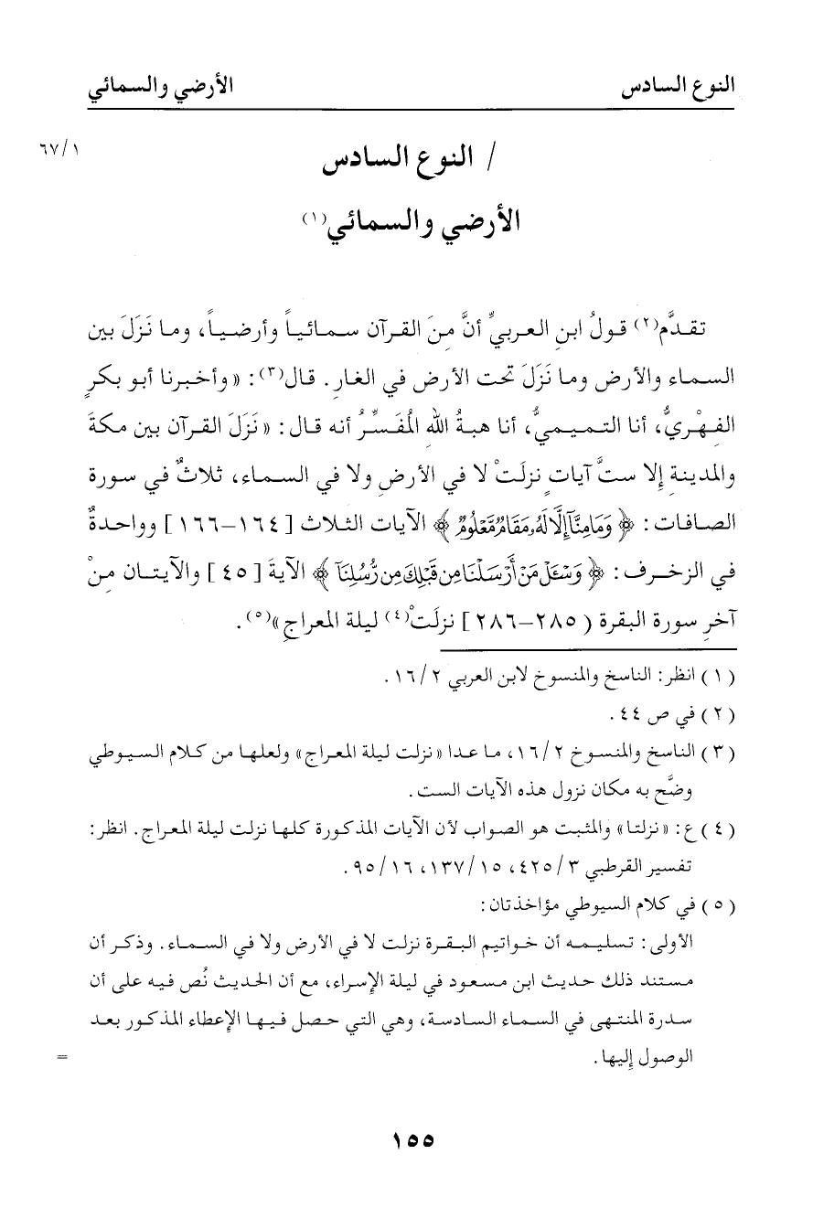 270 تقدم قول ابن العربي إن من القرآن سمائيا وأرضيا وما نزل بين السماء والأرض وما نزل تحت الأرض في الغار قال وأخبرنا أبو بكر الفهري قال أنبأنا التميمي أنبأنا هبة الله المفسر قال نزل القرآن بين مكة والمدينة إلا ست آيات نزلت لا في الأرض ولا في السماء ثلاث في سورة الصافات { وما منا إلا له مقام معلوم } الآيات الثلاث وواحدة في الزخرف { واسأل من أرسلنا من قبلك من } الآية والآيتان من آخر سورة البقرة نزلت ليلة المعراج