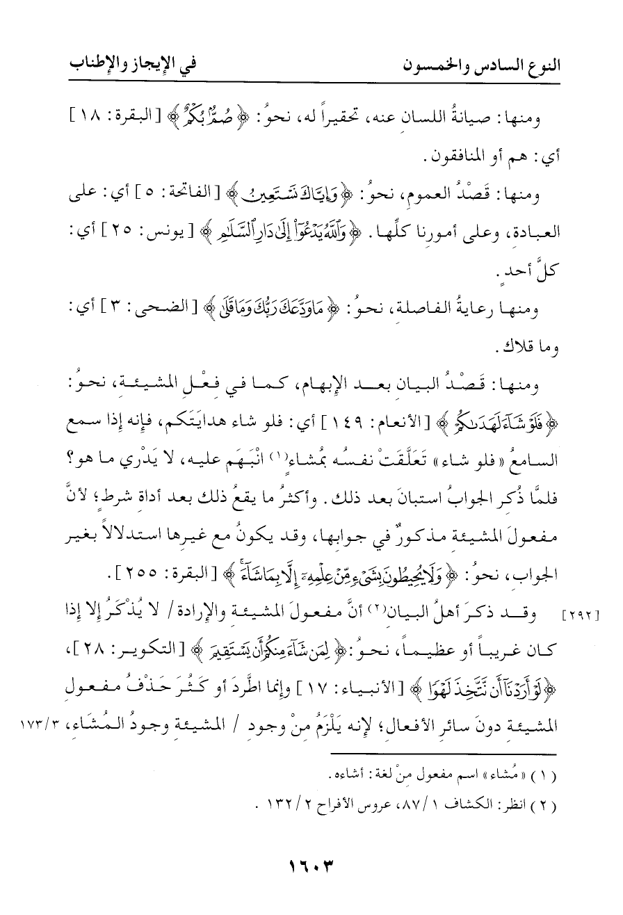 4555 ومنها قصد البيان بعد الإبهام كما في فعل المشيئة نحو { ولو شاء لهداكم } أي ولو شاء هدايتكم فإنه إذا سمع السامع ( ولو شاء ) تعلقت نفسه بم شاء ابنهم عليه لا يدري ما هو فلما ذكر الجواب استبان بعد ذلك وأكثر ما يقع ذلك بعد أداة شرط لأن مفعول المشيئة مذكور في جوابها