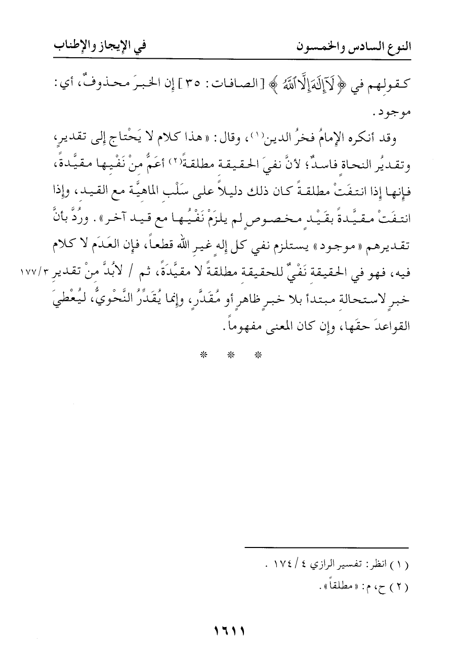 ورد بأن تقديرهم ( موجود ) يستلزم نفي كل إله غير الله قطعا فإن العدم لا كلام فيه فهو في الحقيقة نفي للحقيقة مطلقة لا مقيدة