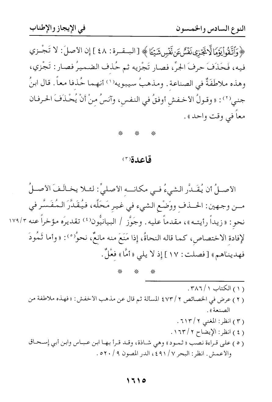 { واتقوا يوما لا تجزي نفس عن نفس شيئا } إن الأصل ( لا تجزى فيه فحذف حرف الجر فصار ( تجزيه ) ثم حذف الضمير فصار ( تجزي ) وهذه ملاطفة في الصناعة ومذهب سيبويه أنهما حذفا معا قال ابن جني وقول الأخفش أوفق في النفس وآنس من أن يحذف الحرفان معا في وقت واحد 1 - قاعدة