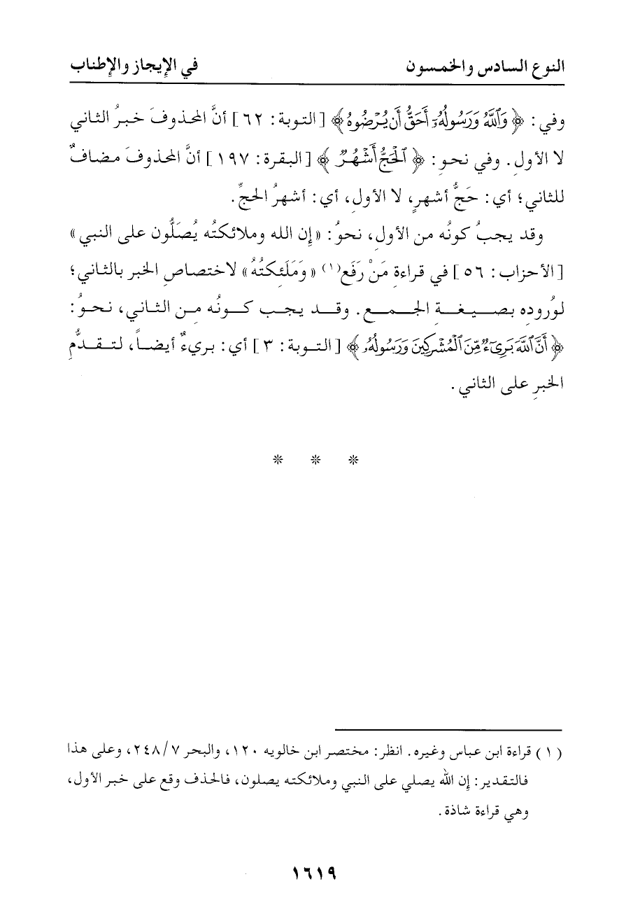 وقد يجب كونه من الأول نحو { إن الله وملائكته يصلون على النبي } في قراءة من رفع ( ملائكته ) لاختصاص الخبر بالثاني لوروده بصيغة الجمع وقد يجب كونه من الثاني نحو { أن الله بريء من المشركين ورسوله } أي بريء أيضا لتقدم الخبر على الثاني