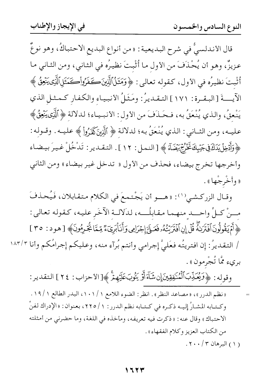 قال الأندلسي في شرح البديعية من أنواع البديع الاحتباك وهو نوع عزيز وهو أن يحذف من الأول ما أثبت نظيره في الثاني ومن الثاني ما أثبت نظيره في الأول كقوله تعالى { ومثل الذين كفروا كمثل الذي ينعق } الآية التقدير ومثل الأنبياء والكفار كمثل الذي ينعق والذي ينعق به فحذف من الأول الأنبياء لدلالة ( الذي ينعق ) عليه ومن الثاني الذي ينعق به لدلالة ( الذين كفروا ) عليه