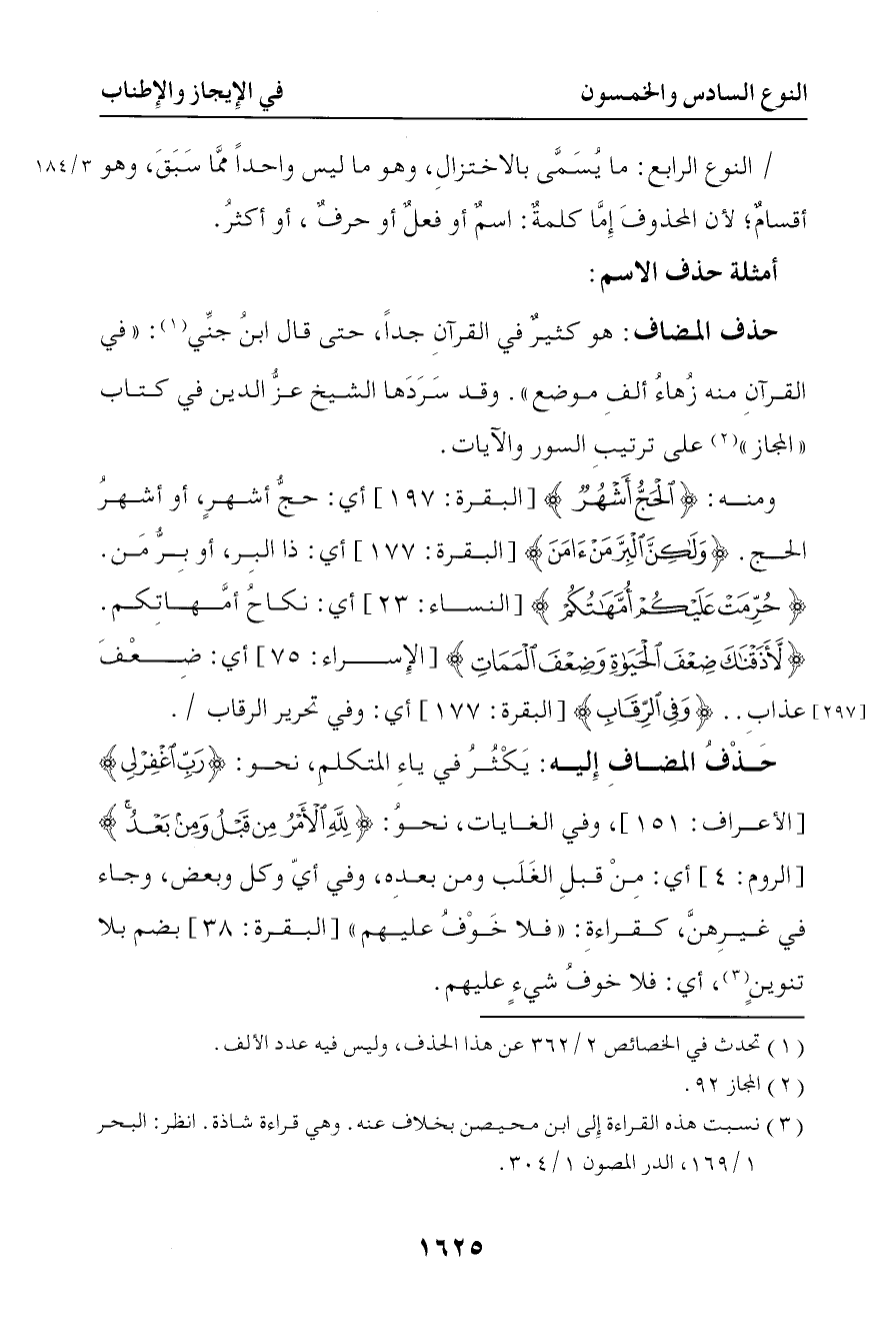 وقد سردها الشيخ عز الدين في كتابه ( المجاز ) على ترتيب السور والآيات ومنه { الحج أشهر } أي حج أشهر أو أشهر الحج