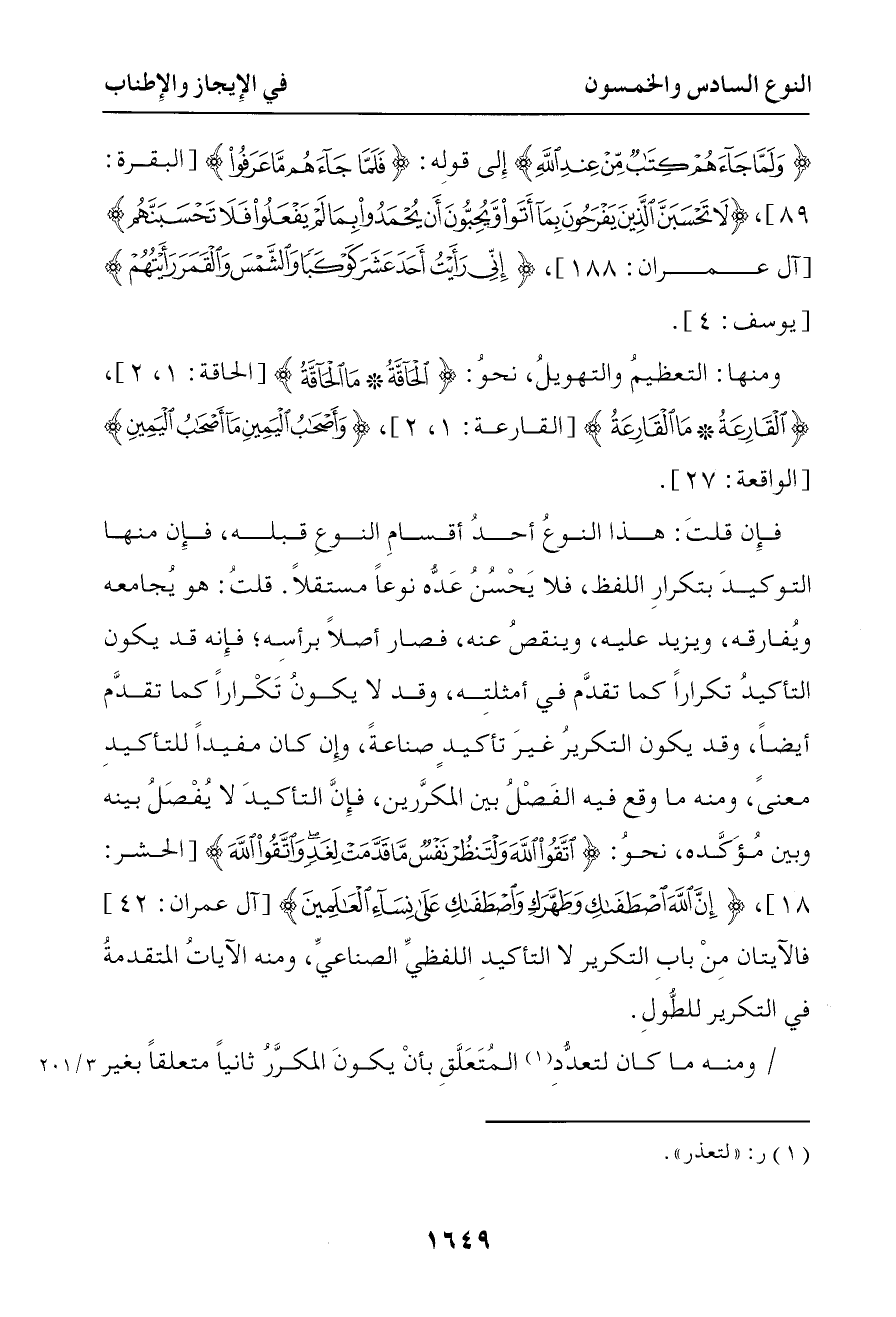 4705 ومنه ما وقع فيه الفصل بين المكررين فإن التأكيد لا يفصل بينه وبين مؤكده نحو { اتقوا الله ولتنظر نفس ما قدمت لغد واتقوا الله } { إن الله اصطفاك وطهرك واصطفاك على نساء العالمين } فالآيتان من باب التكرير لا التأكيد اللفظي الصناعي