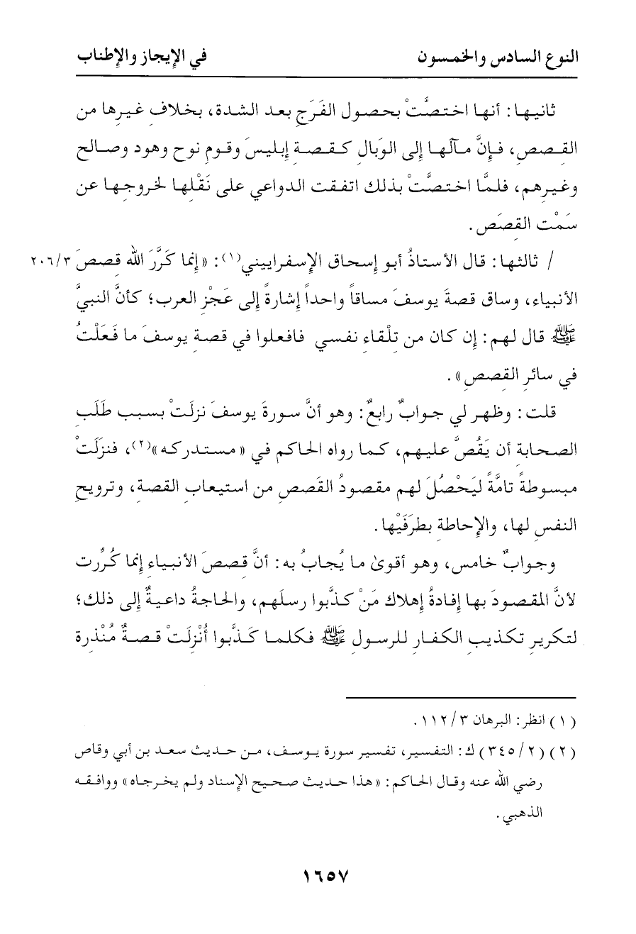 قلت وظهر لي جواب رابع وهو أن سورة يوسف نزلت بسبب طلب الصحابة أن يقص عليهم كما رواه الحاكم في مستدركه فنزلت مبسوطة تامة ليحصل لهم مقصود القصص من إستيعاب القصة وترويح النفس بها والإحاطة بطرفيها