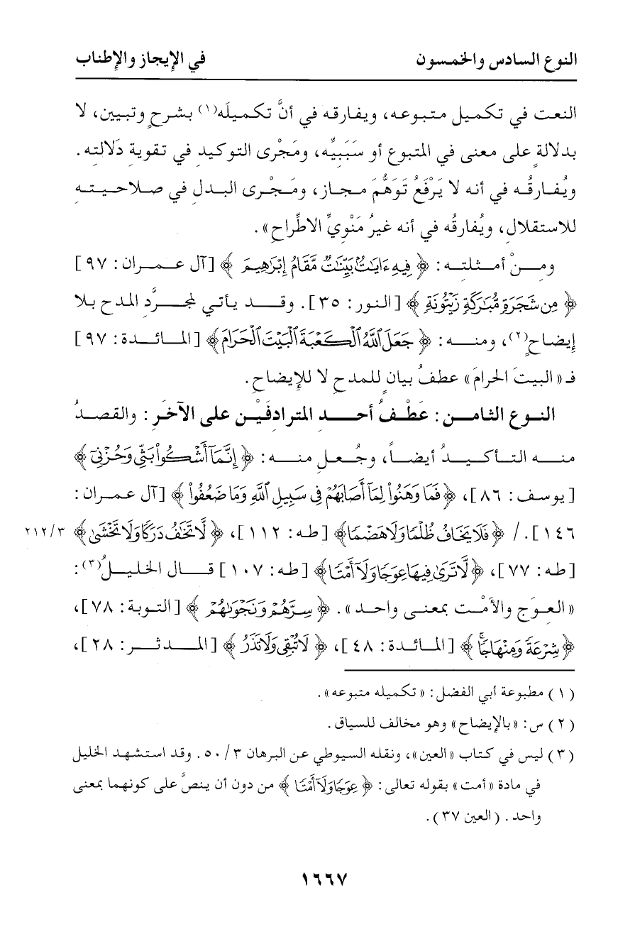 4760 وقد يأتي لمجرد المدح بلا إيضاح ومنه { جعل الله الكعبة البيت الحرام } فالبيت الحرام عطف بيان للمدح لا للإيضاح النوع الثامن عطف أحد المترادفين على الآخر