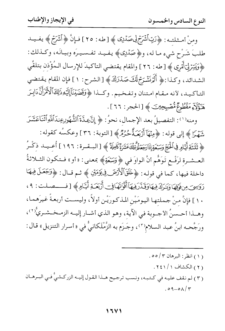 4775 ومنه التفصيل بعد الإجمال نحو { إن عدة الشهور عند الله اثنا عشر شهرا } إلى قوله { منها أربعة حرم } وعكسه كقوله { ثلاثة أيام في الحج وسبعة إذا رجعتم تلك عشرة كاملة } أعيد ذكر ( العشرة ) لرفع توهم أن الواو في ( وسبعة ) بمعنى ( أو ) فتكون الثلاثة داخلة فيها كما في قوله { خلق الأرض في يومين } ثم قال { وجعل فيها رواسي من فوقها وبارك فيها وقدر فيها أقواتها في أربعة أيام } فإن من جملتها اليومين المذكورين أولا وليست أربعة غيرهما