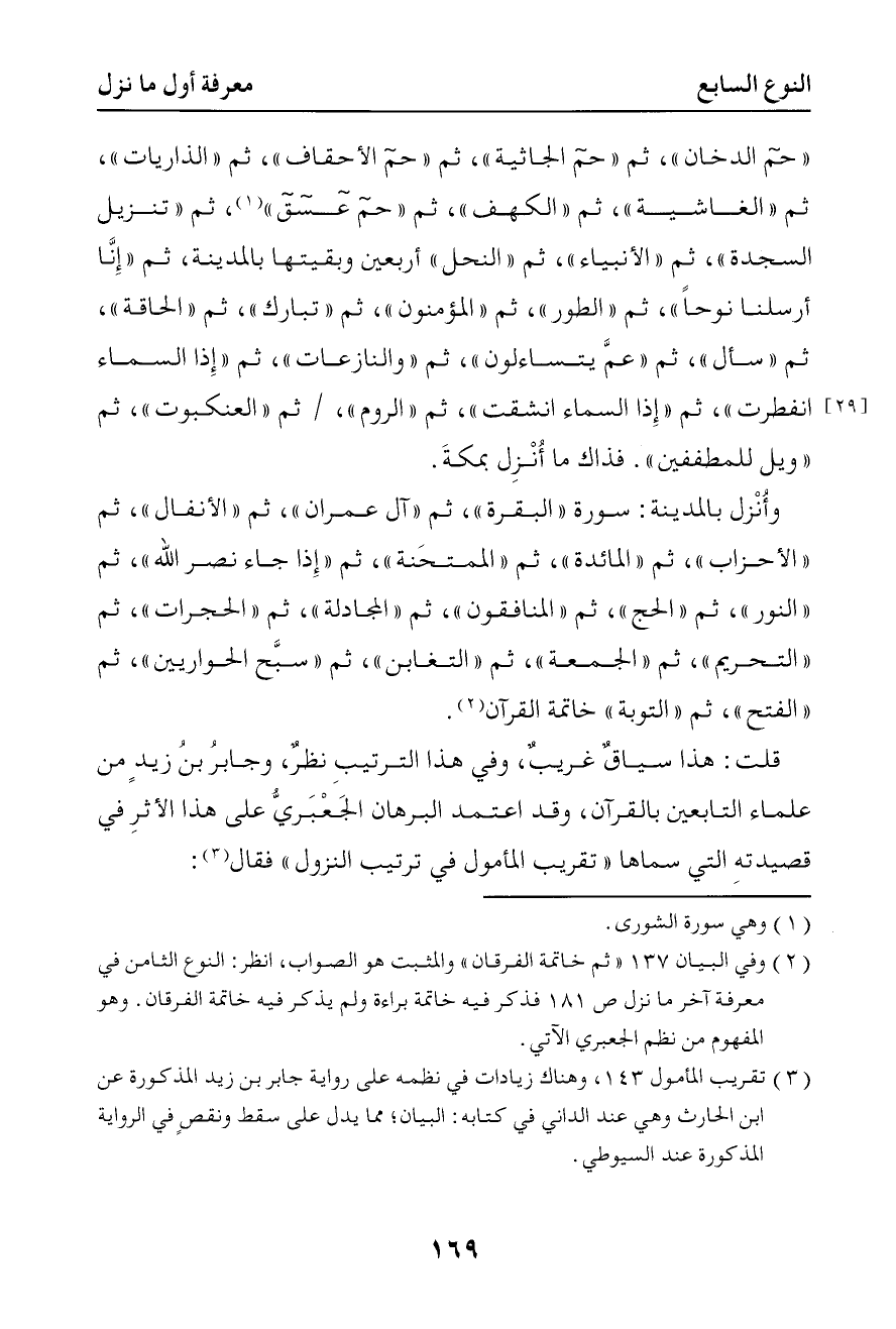 296 قلت هذا سياق غريب وفي هذا الترتيب نظر وجابر بن زيد من علماء التابعين بالقرآن وقد اعتمد البرهان الجعبري على هذا الأثر في قصيدته التي سماها تقريب المأمول في ترتيب النزول فقال